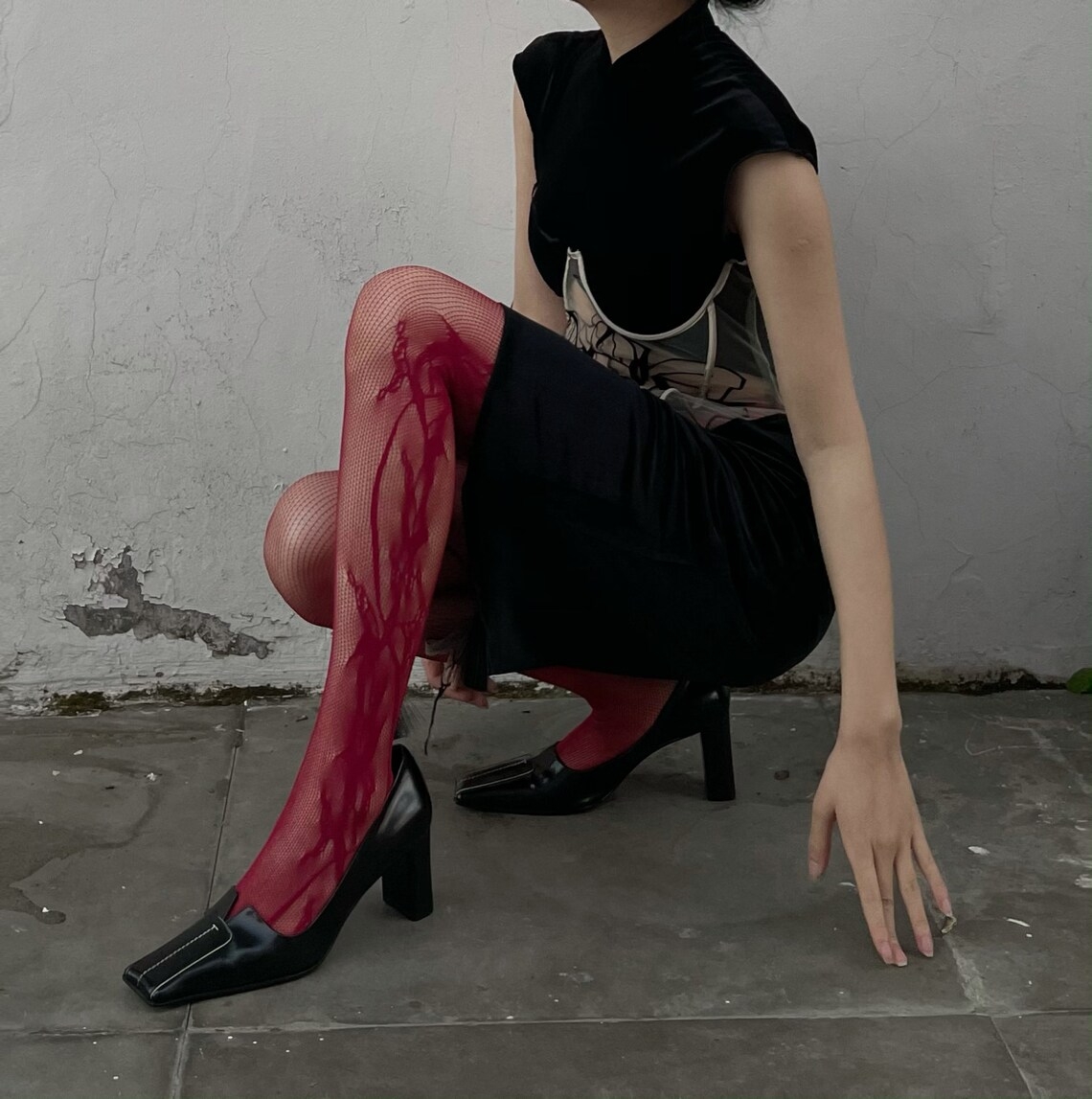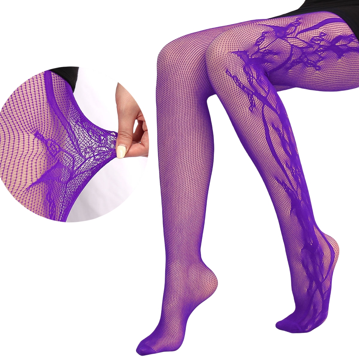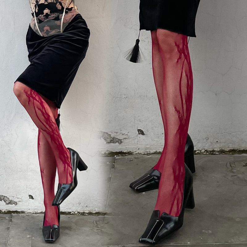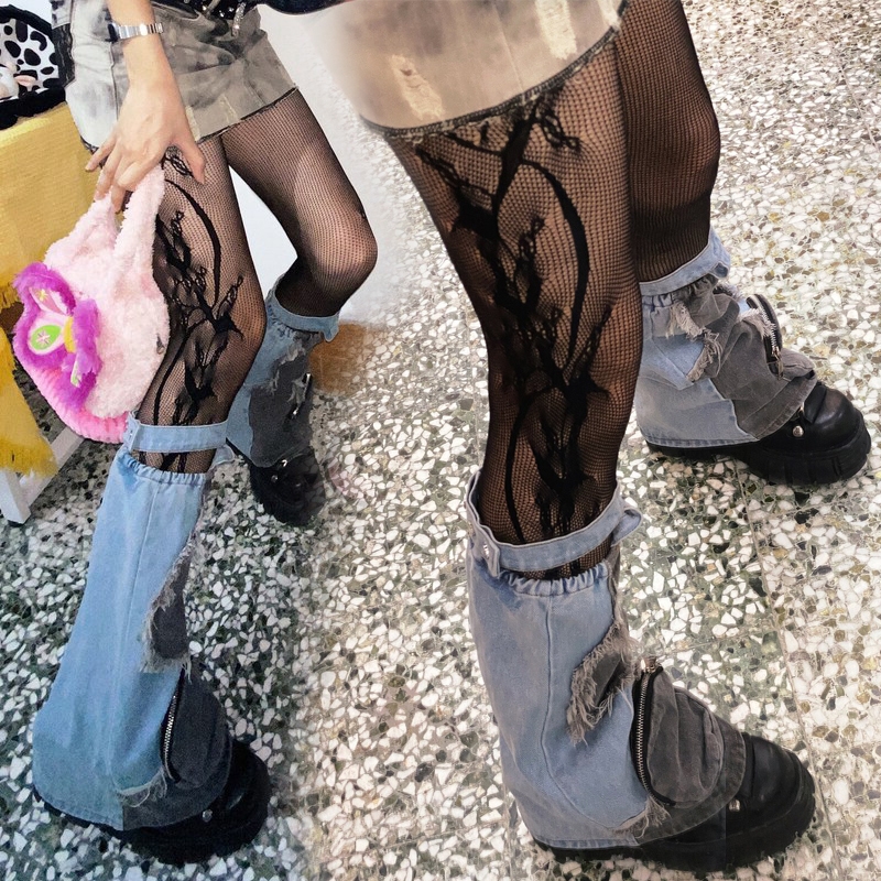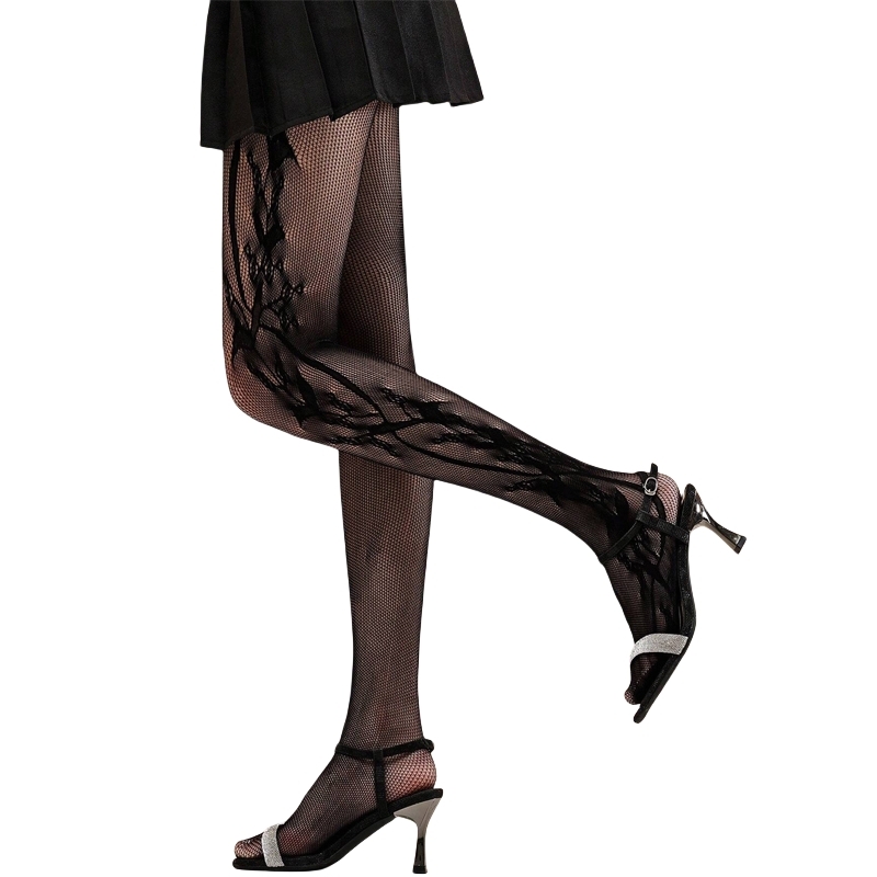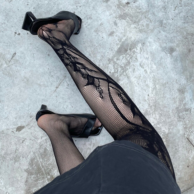 Summer Fashion Women’s y2k Side Vine-Patterned Fishnet Tights See-through Black Floral Lace Tights Ladies Nylon Net Pantyhose
