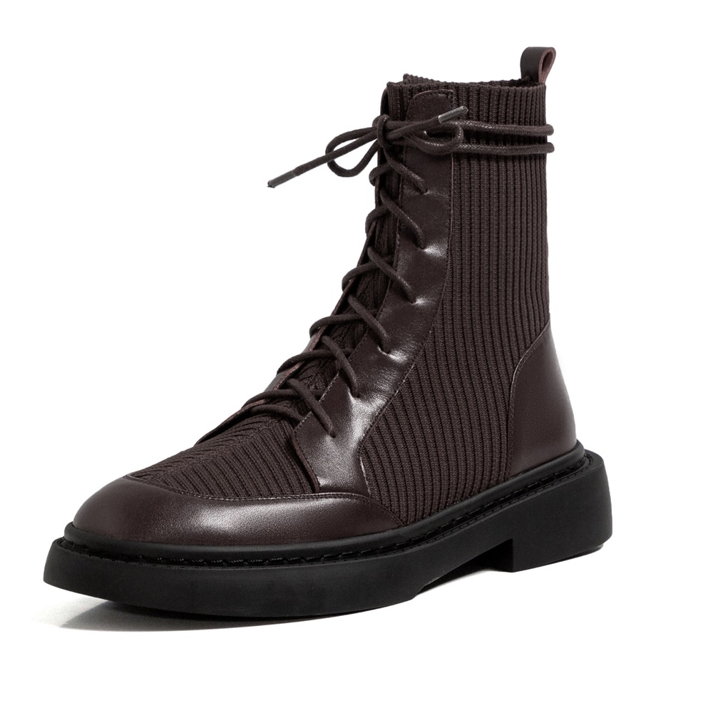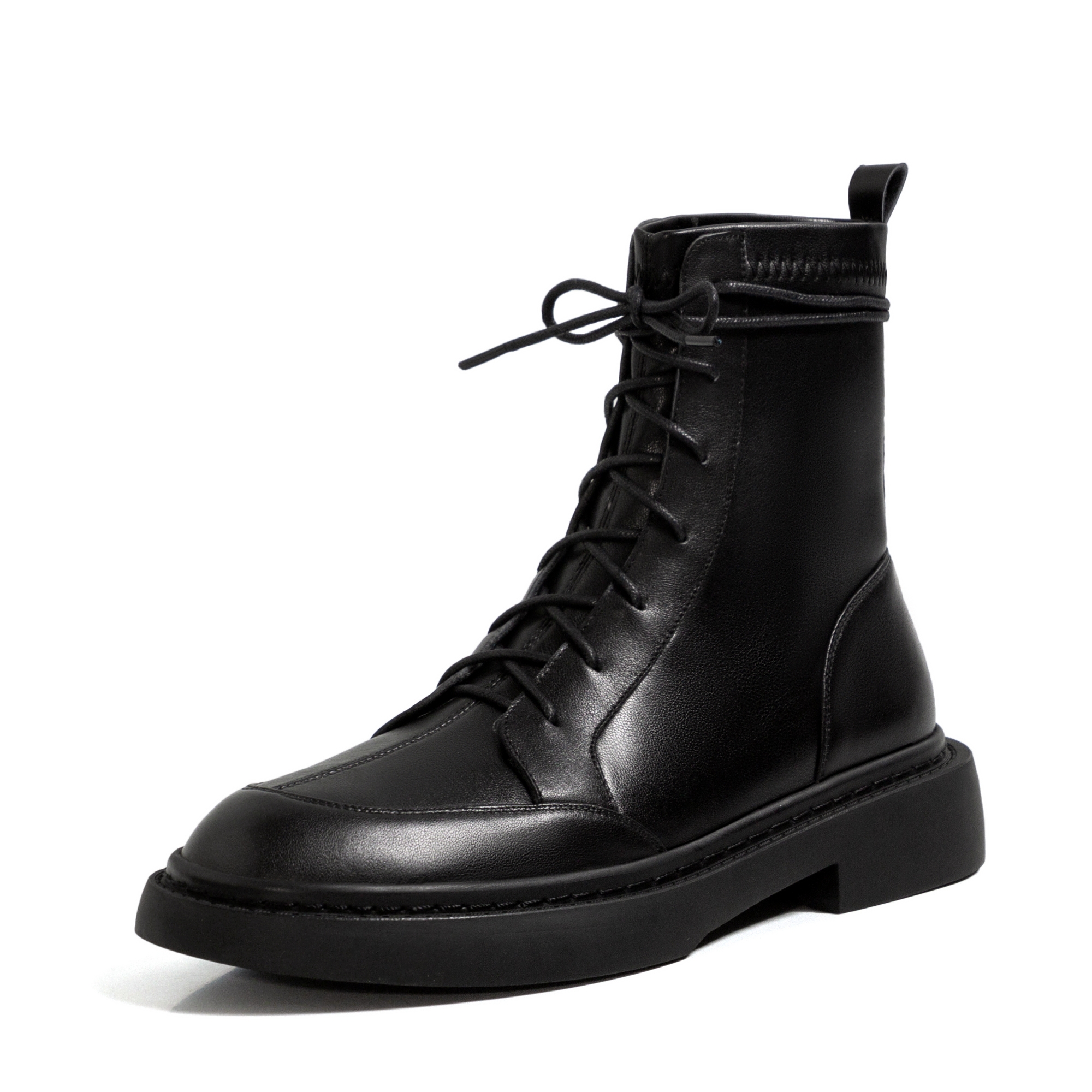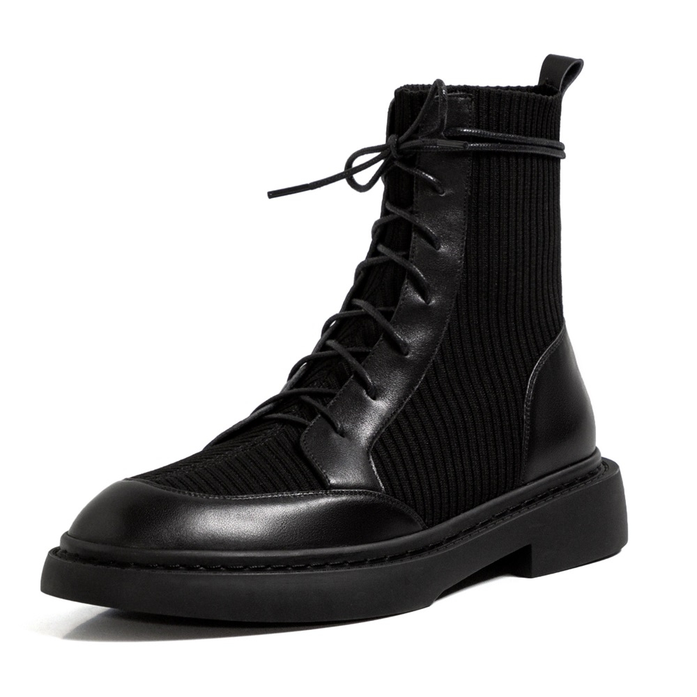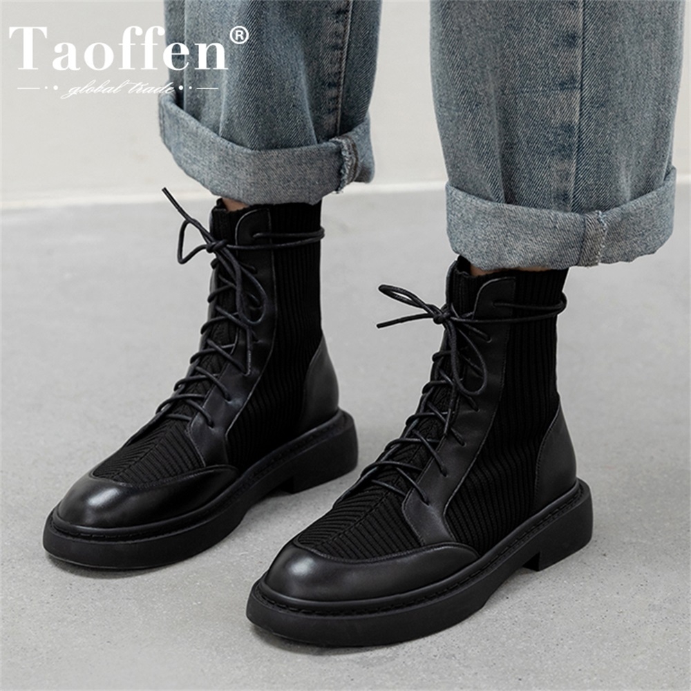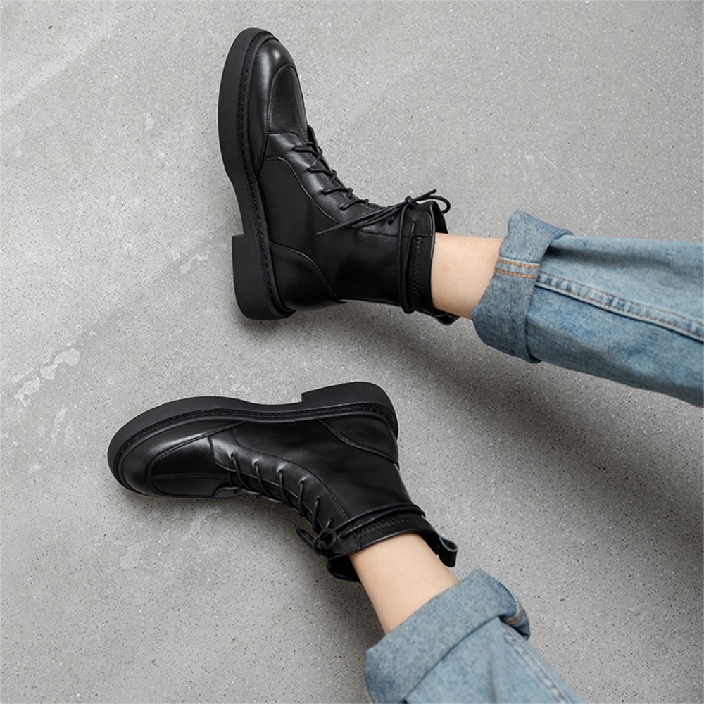 Taoffen 2024 Fashion Genuine Leather Women Boots Soft Leather Thick Bottom Lace Up Splicing Boots Flat Black Motorcycle Shoes