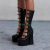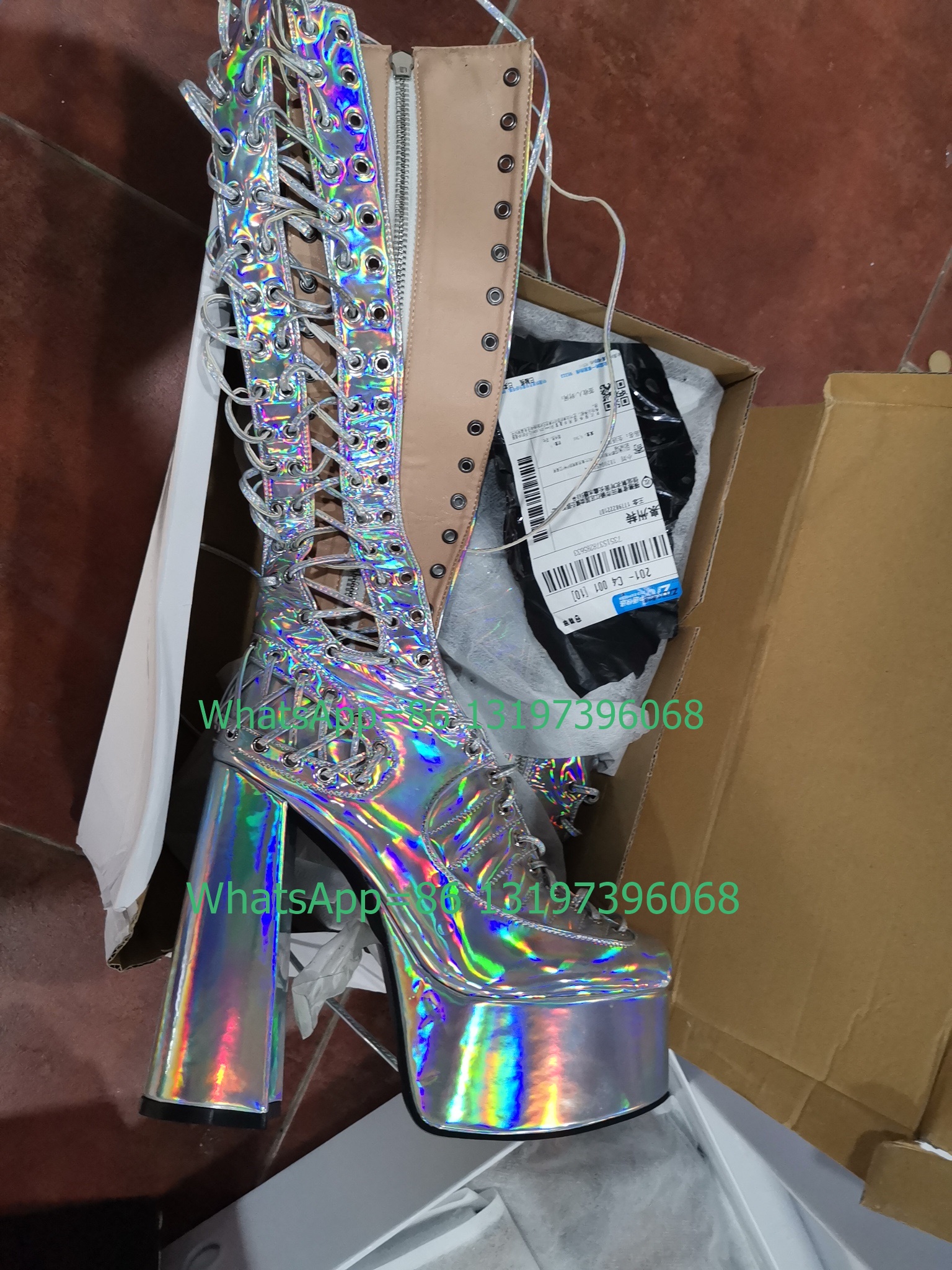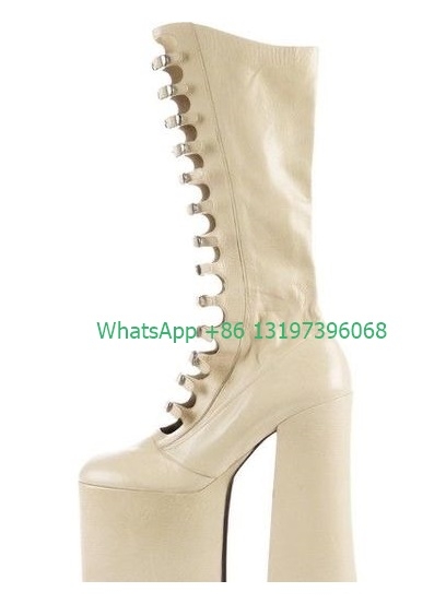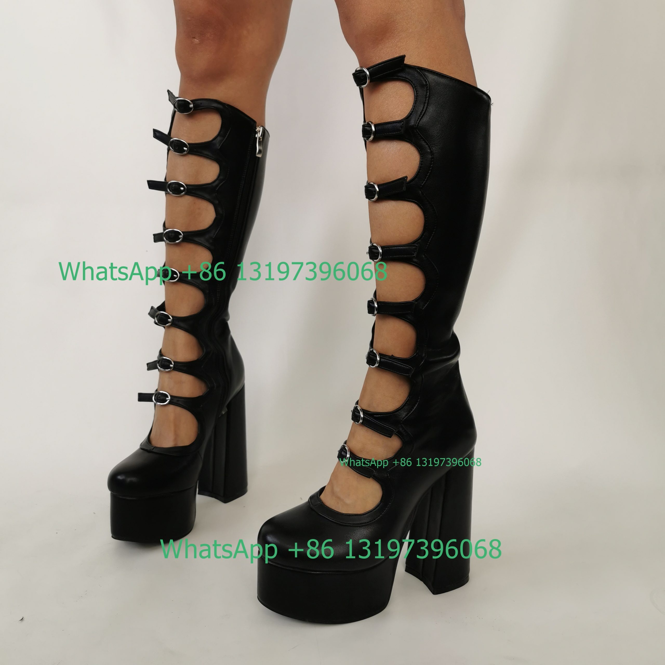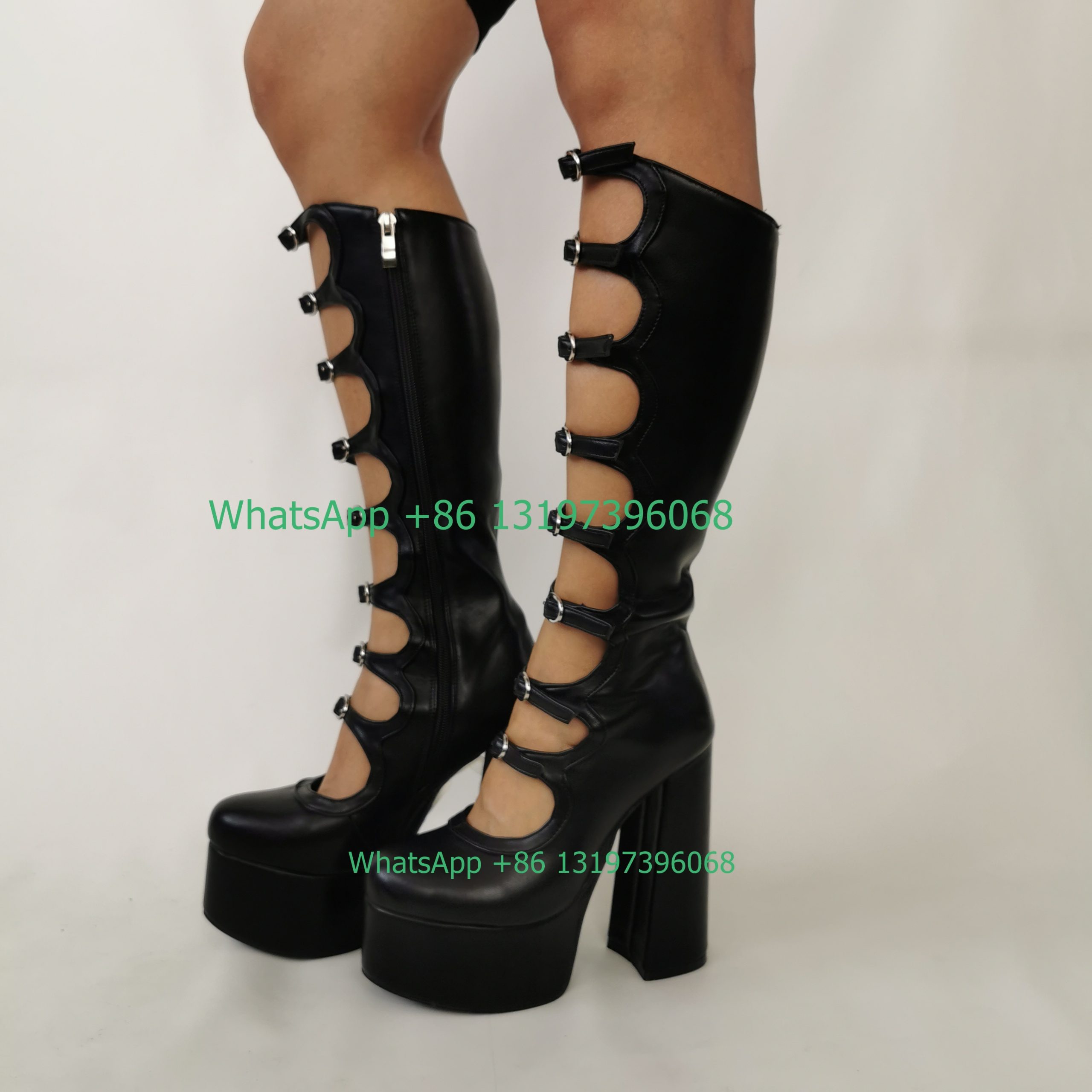Thick Sole Black Hollow Calf Boots Side Zipper Rough Square Heel Pole Dance Shoes Super Heel Sexy Boots Large Size Footwear