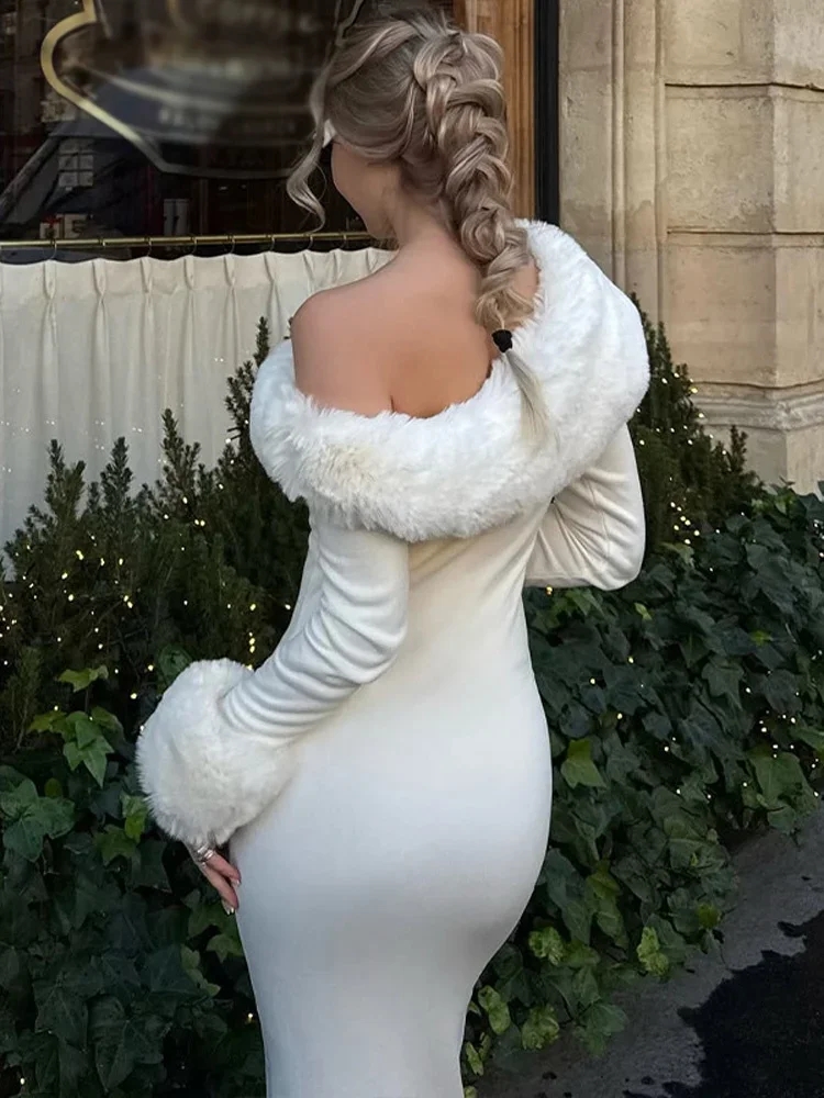Tossy Fluffy Winter Slim Maxi Dress Female High Waist Long Sleeve Sexy Off-Shoulder Patchwork Bodycon Dress Ladies Party Dress