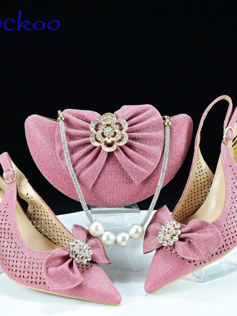 2024 Super High Heels New Arrivals Italian Women Shoes and Bag Set in Pink Color Pointed Toe with Appliques For Dress