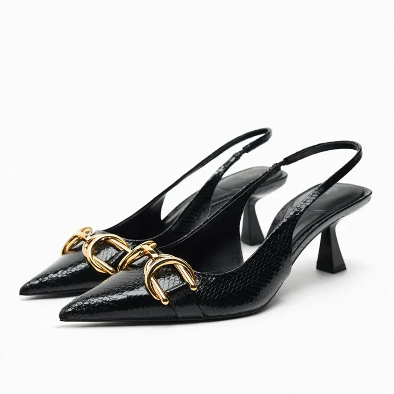 TRAF Women Summer Black Pumps 2024 Golden Decorative Details Pointed High Heels Shallow Thin Heel Woman Shoes Slingback Sandals
