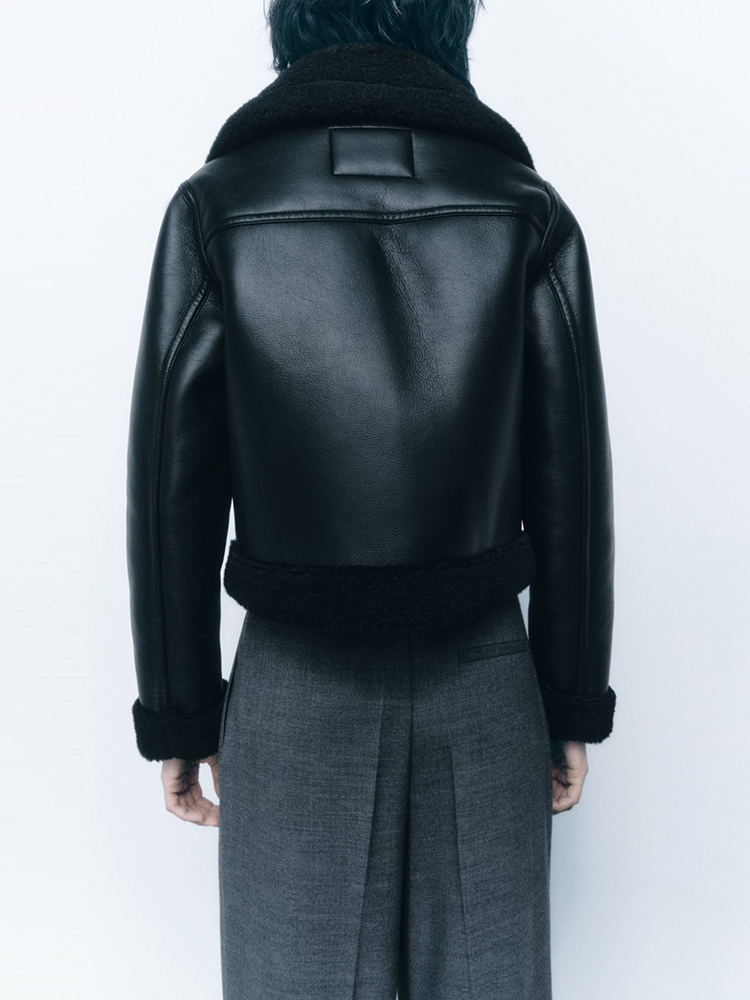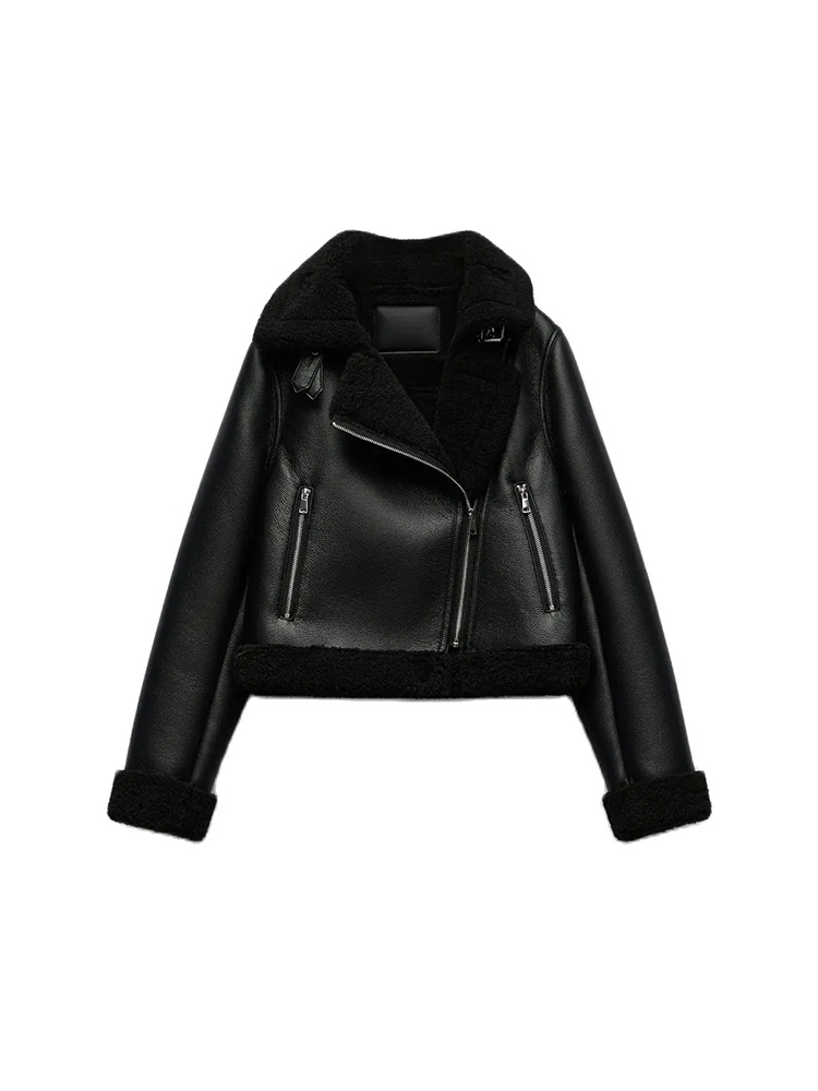 TRAF Fleeced Faux Leather Jacket Women Outerwears Vintage Cold Faux Wool & Blends Coats For Woman Autumn Winter Plush Jacket