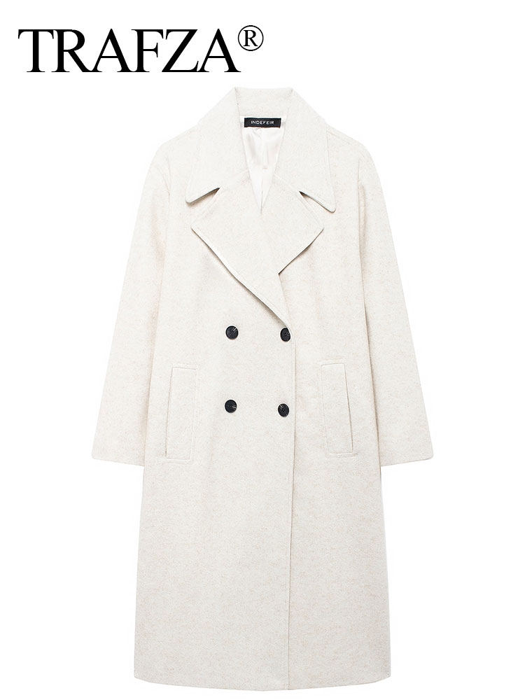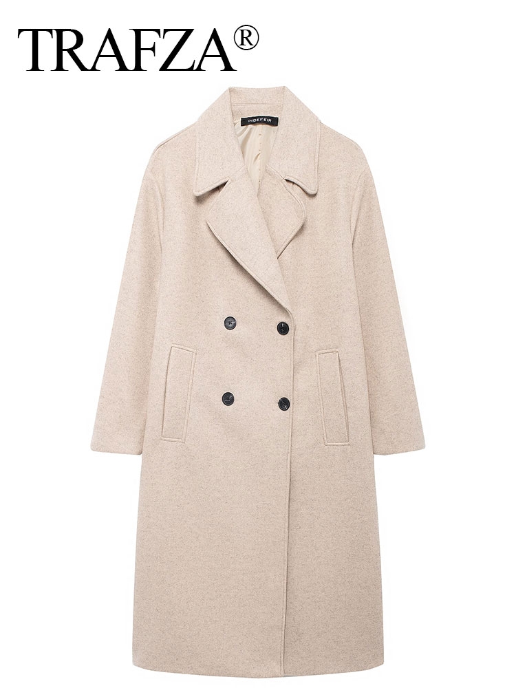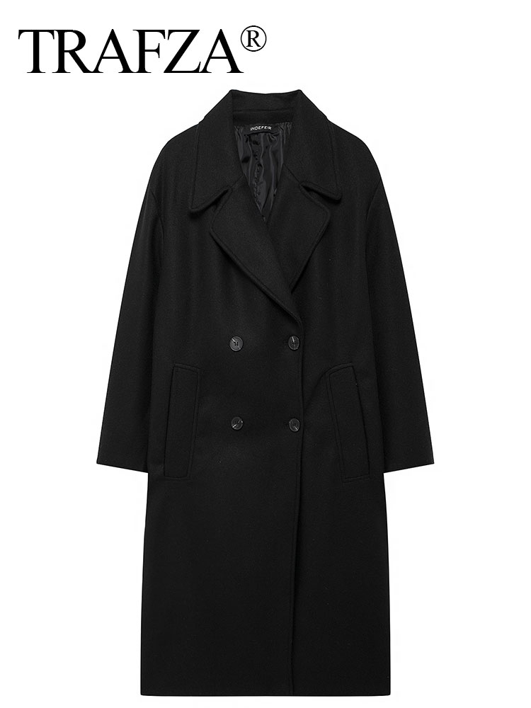 TRAFZA 2024 Autumn New Women Loose Coat Lapel Double Breasted Long Sleeve Jacket Winter Warm Thick Vintage Solid Trench Outwear