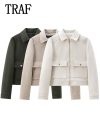 TRAF Fleeced Faux Leather Jacket Women Outerwears Vintage Cold Faux Wool & Blends Coats For Woman Autumn Winter Plush Jacket