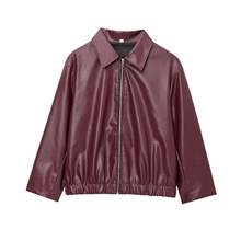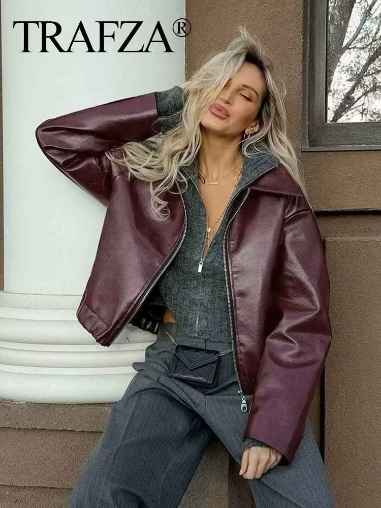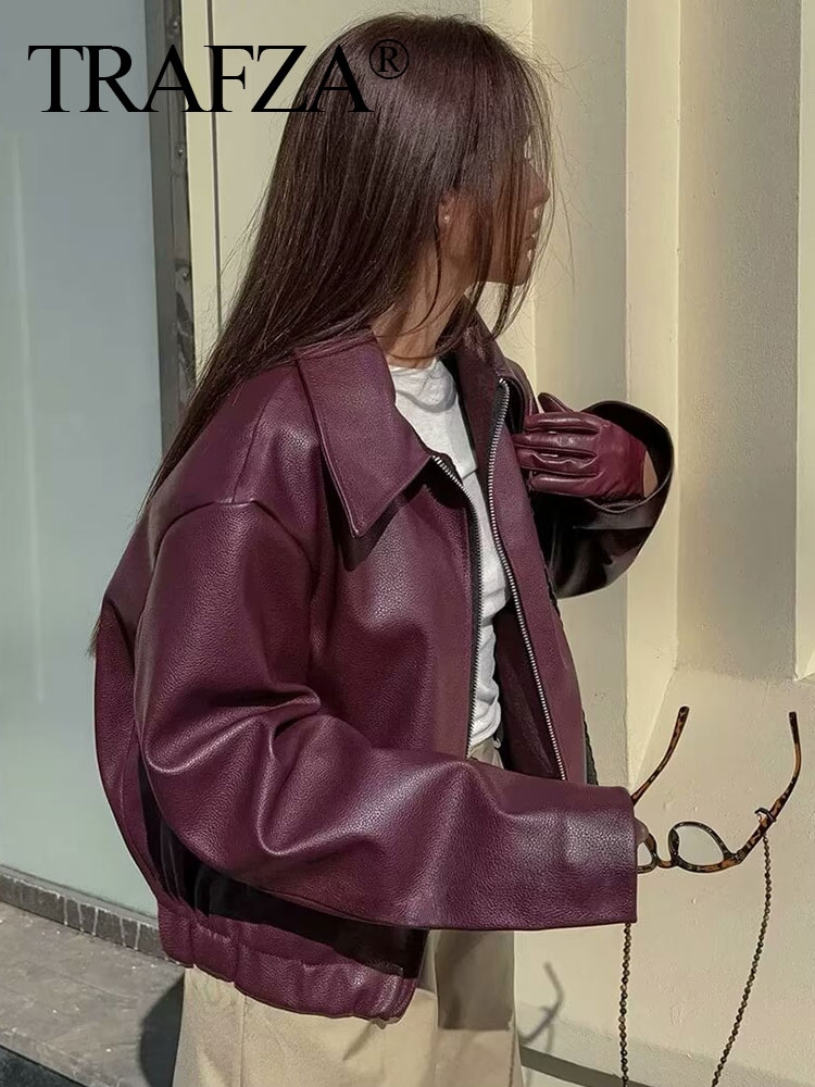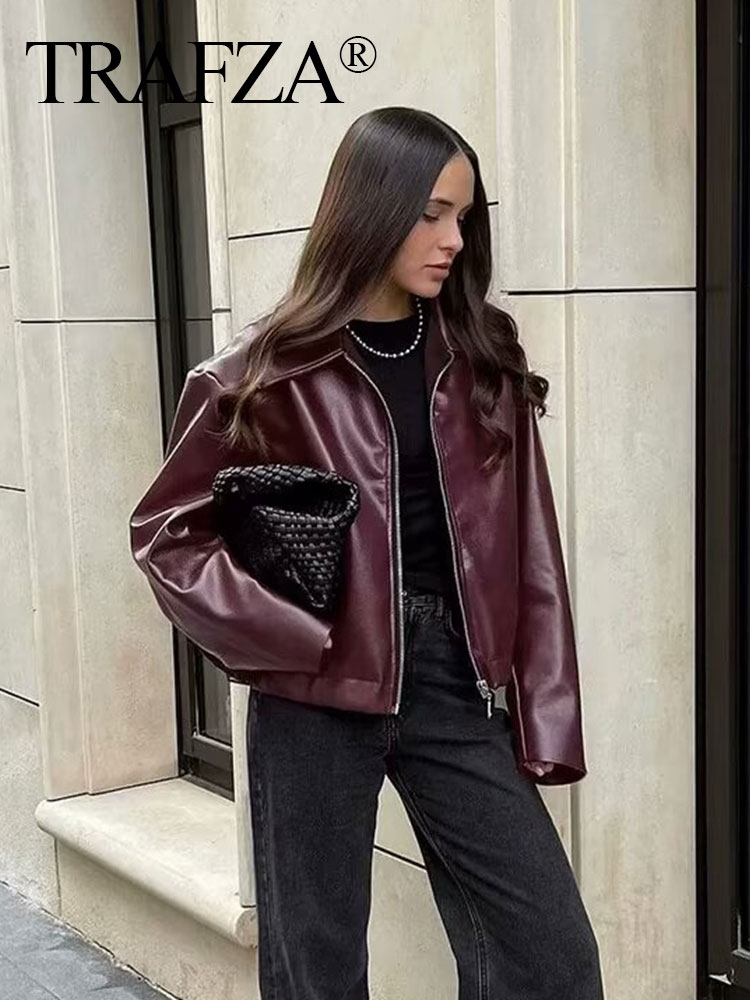 TRAFZA Wine Red Faux Leather Jakcet Fashion Outerwear Thicken Zipper Lapel Pu Coats Autumn Winter Streetwear Ladies Tops Women