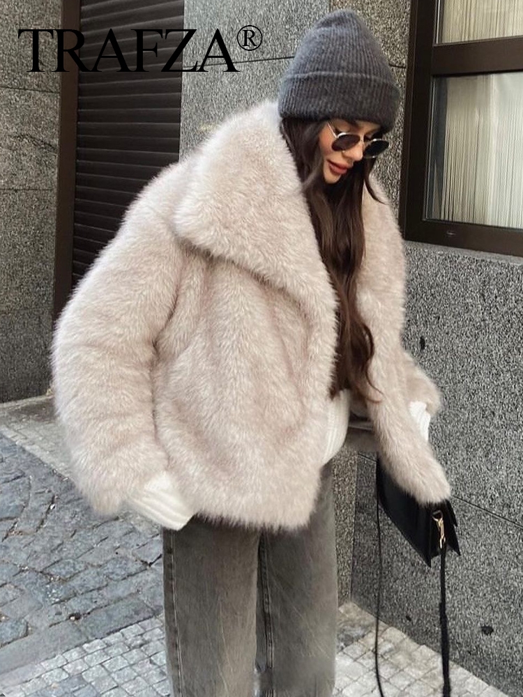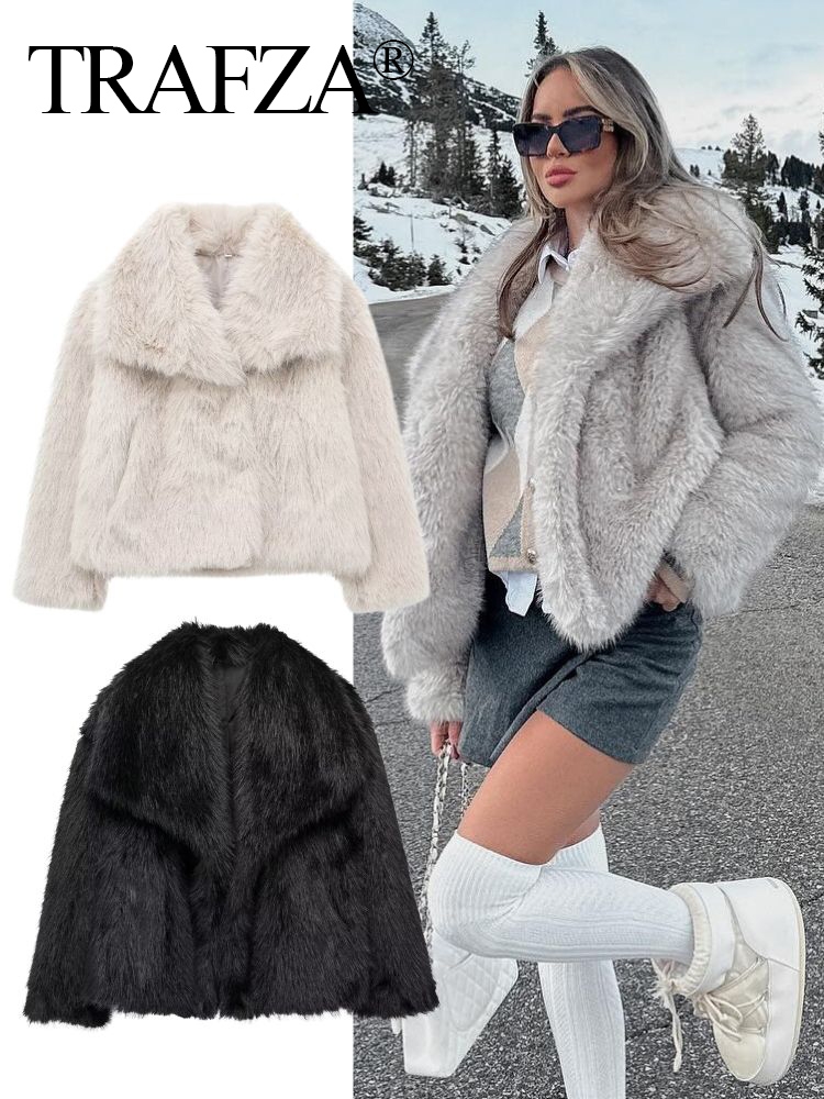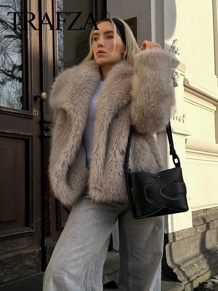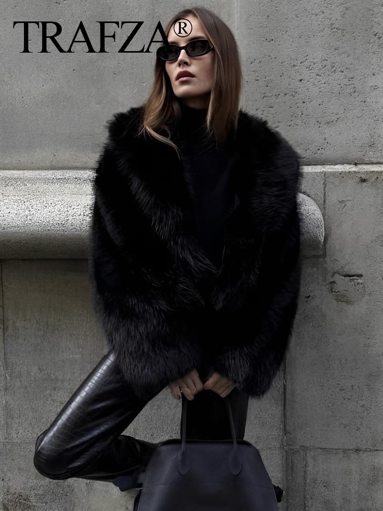 TRAFZA Women Vintage Cropped Faux Fur Jacket Coat 2024 Elegant Loose Long Sleeve Jacket Female Thick High Street Outerwear