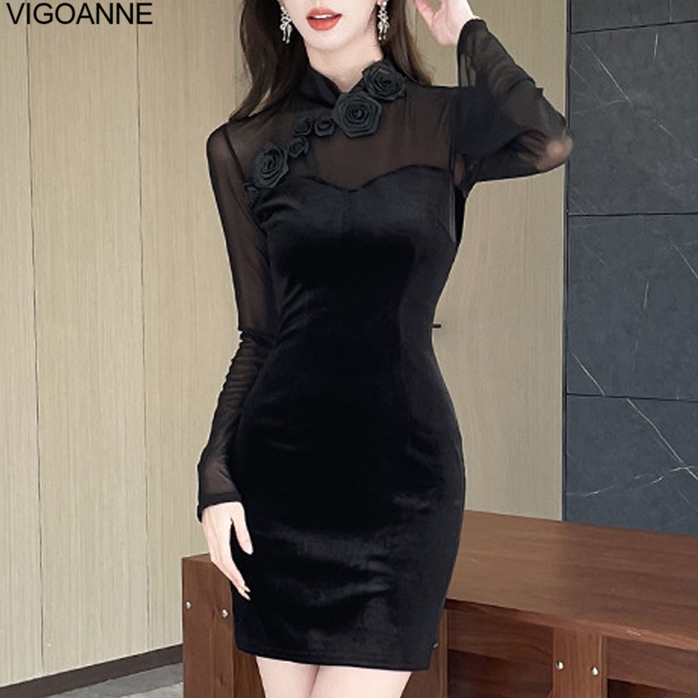 VigoAnne 2025 Woman Solid Mesh Patchwork Dress Spring Summer Long Sleeve Korean Dresses Lady Evening Party Tight Long Dress