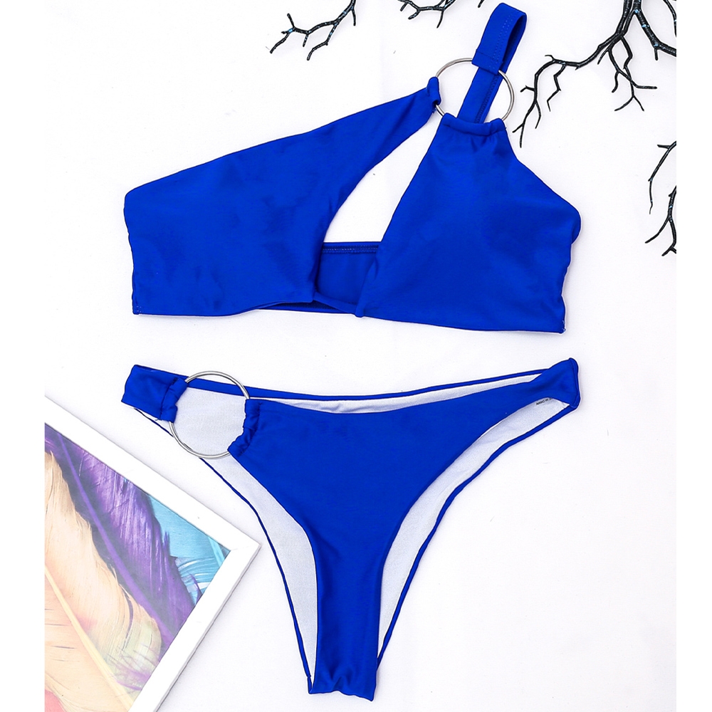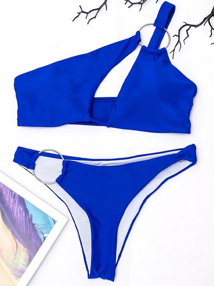 Vigoashely Blue One Shoulder Swimwear Women Sexy High Cut Hollow Bikini Set 2025 Ring Push Up Swimsuit Summer Beach Bathing Suit
