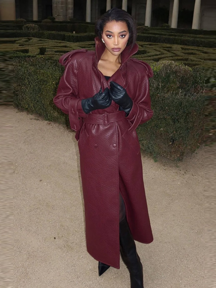 Vintage PU Leather Belts Long Jacket For Women Double Breasted Turn-down Collar Street Coats Motorcycle Female Winter Outwear