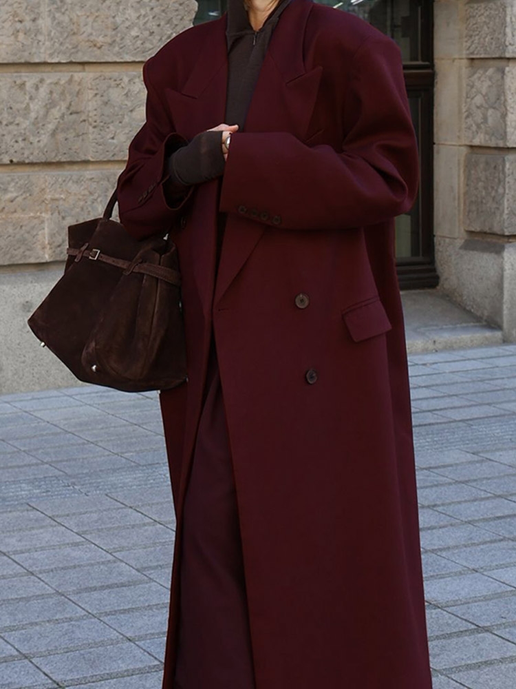 Vintage Wine Red Lapel Double Breasted Overcoat Elegant Loose Long Sleeve Pockets Woolen Coat Lady Autumn Commute Streetwear