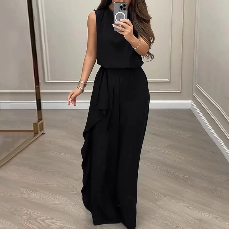 Wefads 2 Piece Set Women Fashion Casual Round Neck Solid Sleeveless Pullover Top Loose With Ruffled Pants Sets High Streetwear