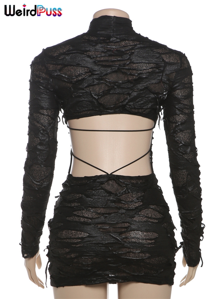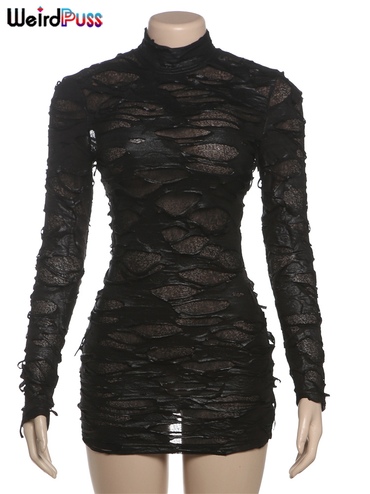 Weird Puss Destruction Style Dress Women Autumn Trend Turtleneck Backless See Through Full Sleeve Skinny Stretch Mini Bodycon