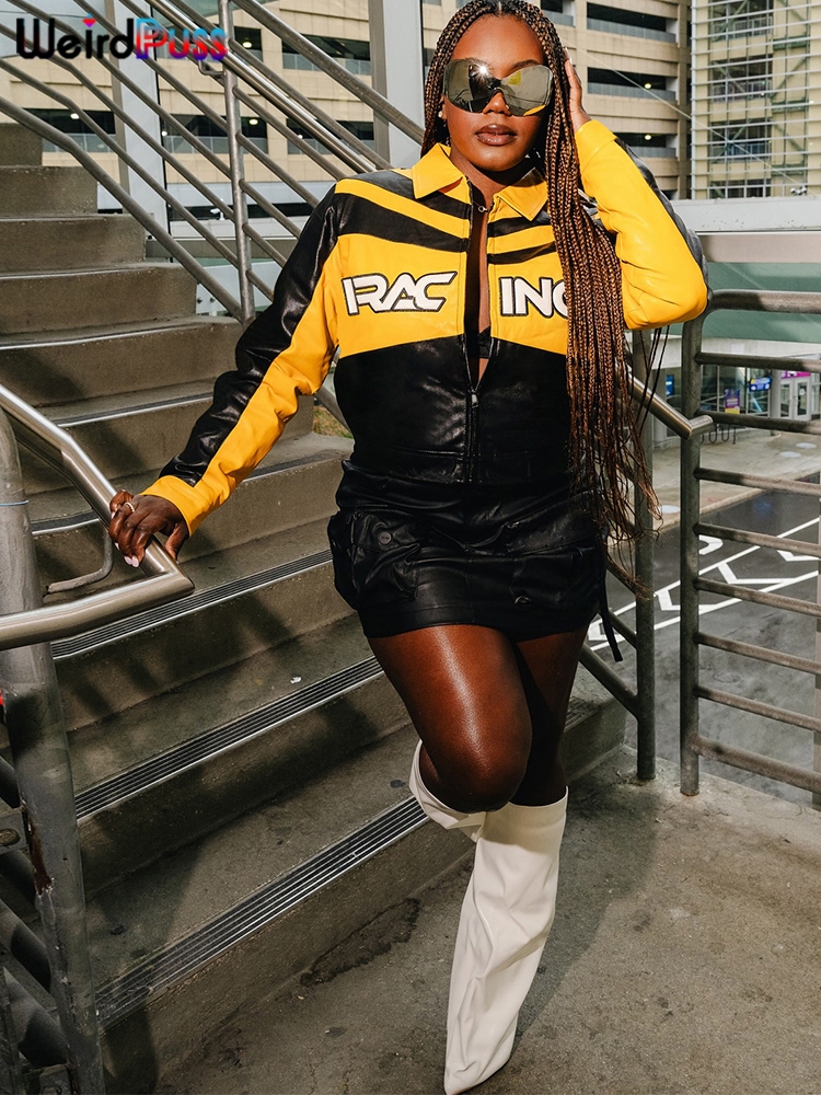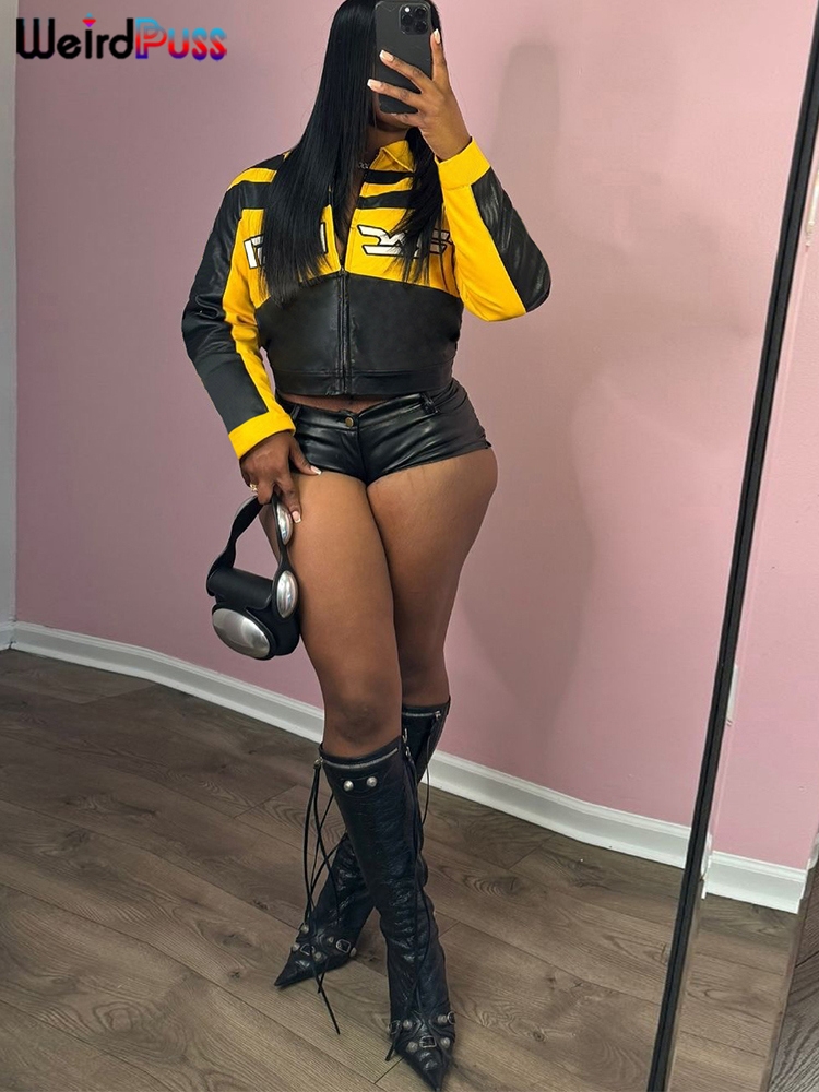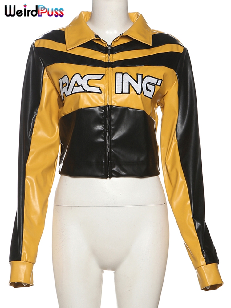 Weird Puss Faux Leather Crop Jacket Women Letter Embroidery Patchwork Lapel Zip Full Sleeve Fall Trend Streetwear Hipster Coat