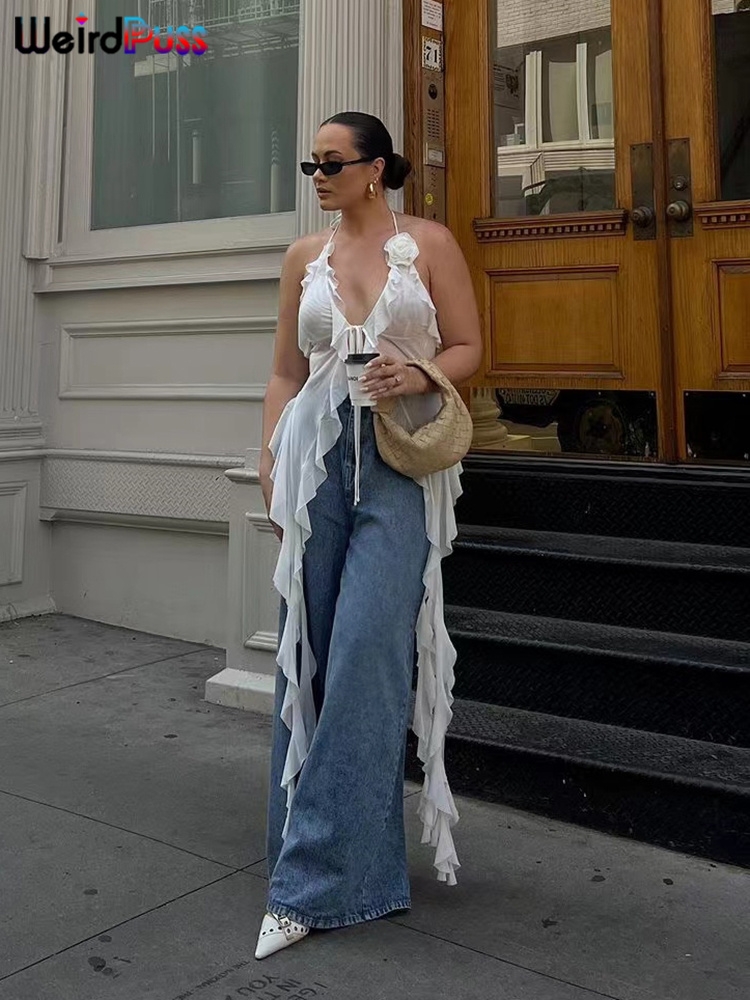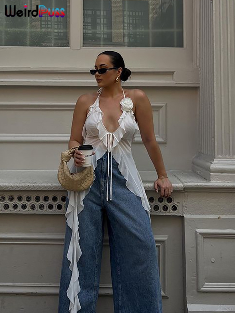 Weird Puss Ruffles Flowers Tank Tops Women Mesh Summer Sexy Deep V-Neck Irregular Tassel Halter Backless Camisole Wild Street
