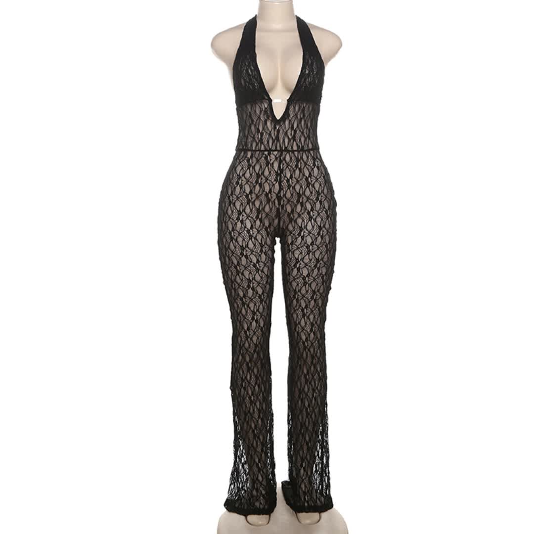 Weird Puss Sexy Mesh Halter Jumpsuit Women Backless Skinny Low-Neck Midnight Birthday Party Clubwear Activity Workout Overalls