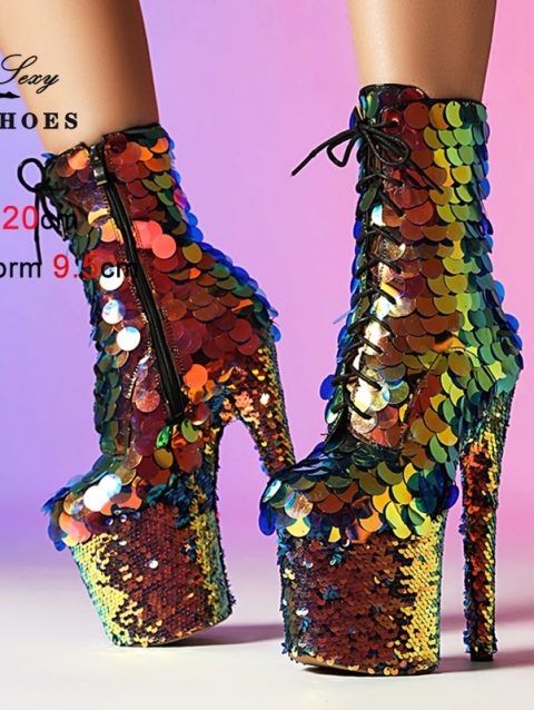 Women Ankle Boots Sequined Platform Zip Glitter 20cm Thin High Heels Booties Pole Dance Shoes Woman 8Inch Nightclub Sexy Boots