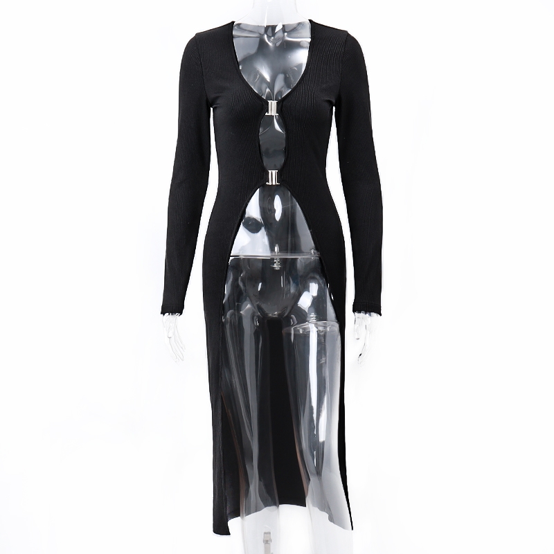 2 reviews for WhereMery Sexy Hollow Out Long Sleeve Maxi T Shirt Women V Neck Low Cut Metal Button Black Top Streetwear Cusual Lady Tops Tees