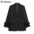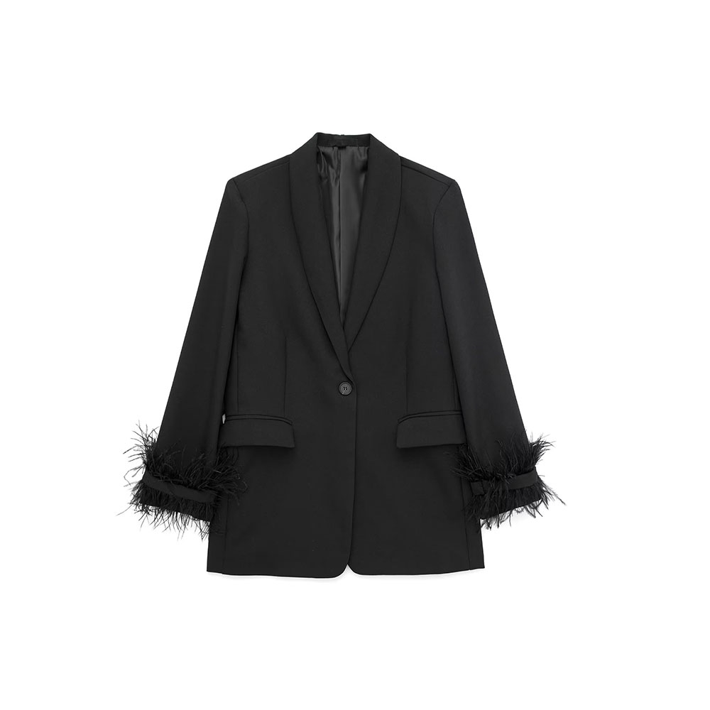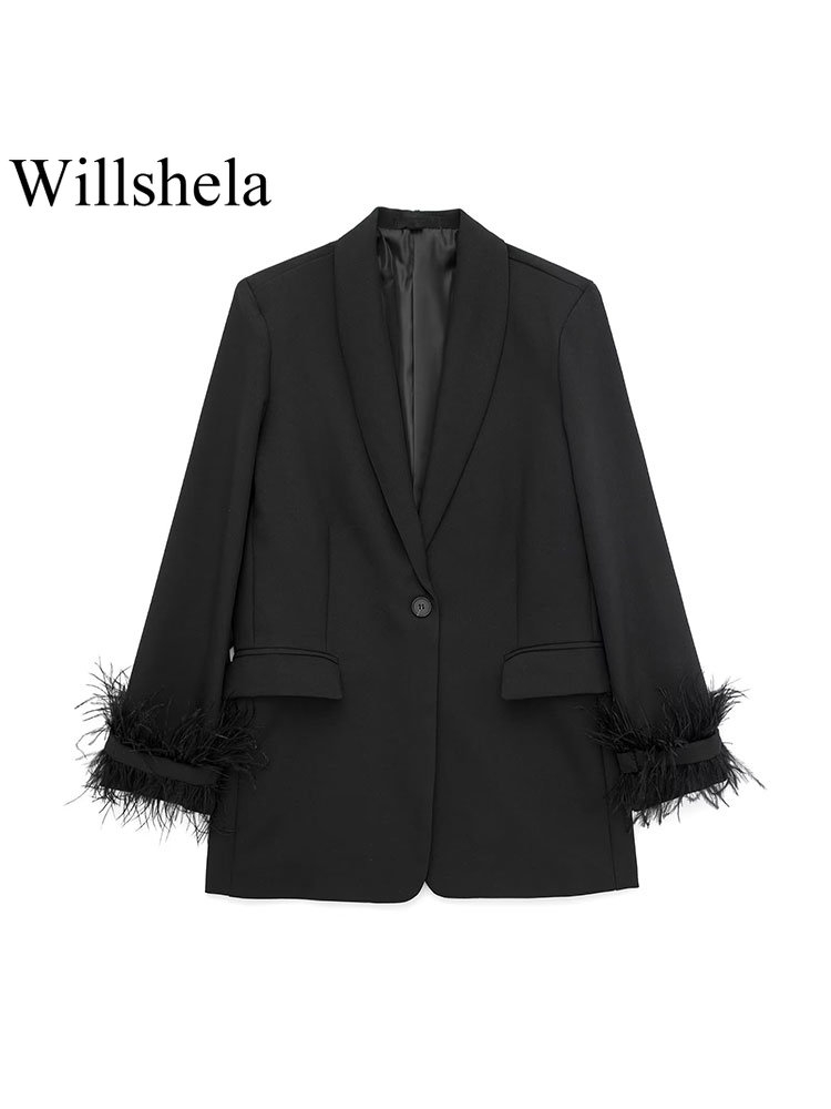 Willshela Women Fashion Satin Black With Feather Blazer Jacket Vintage Notched Neck Single Button Long Sleeves Female Outfits