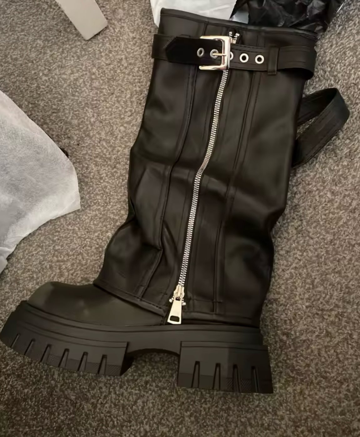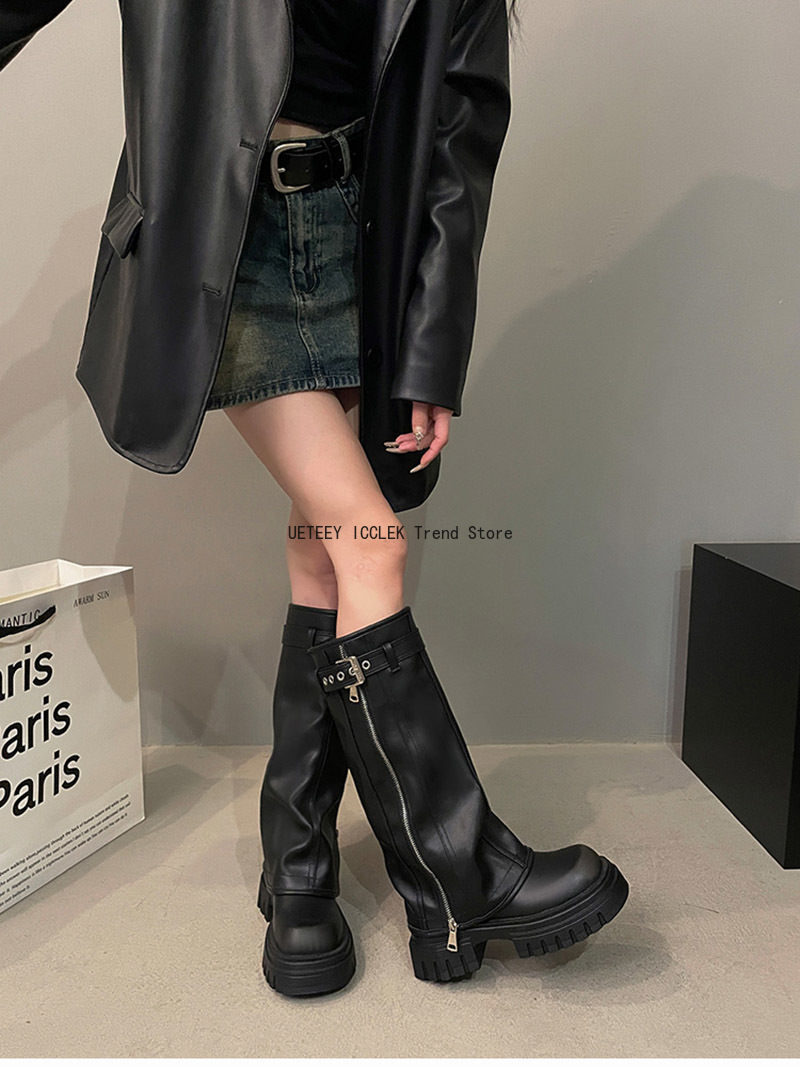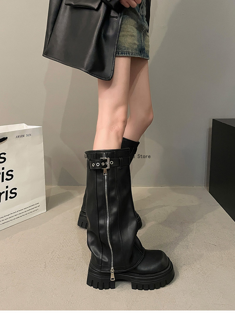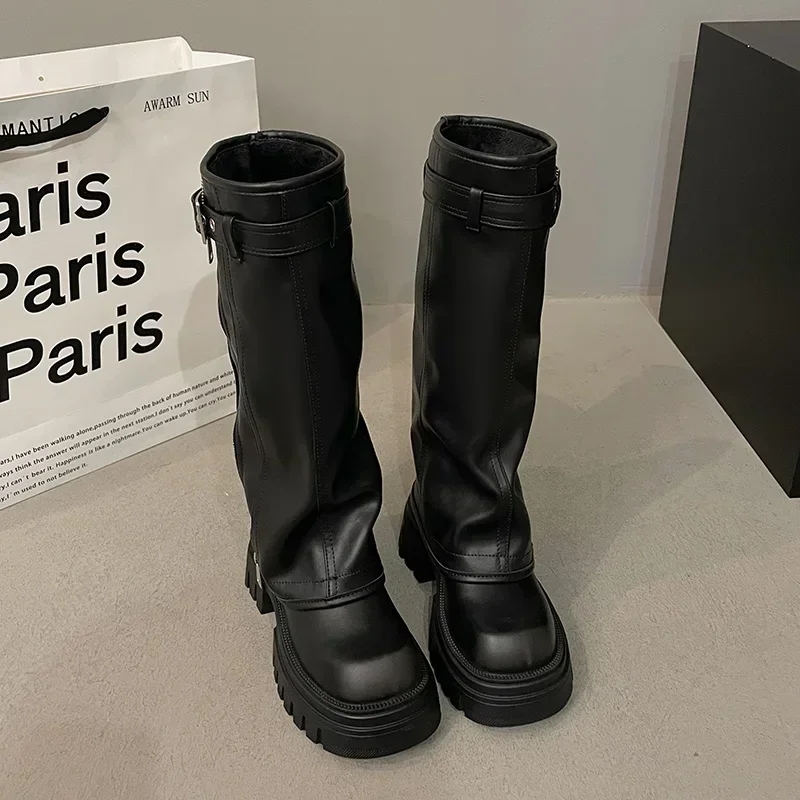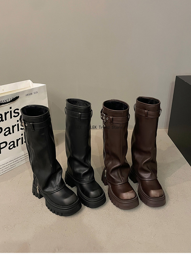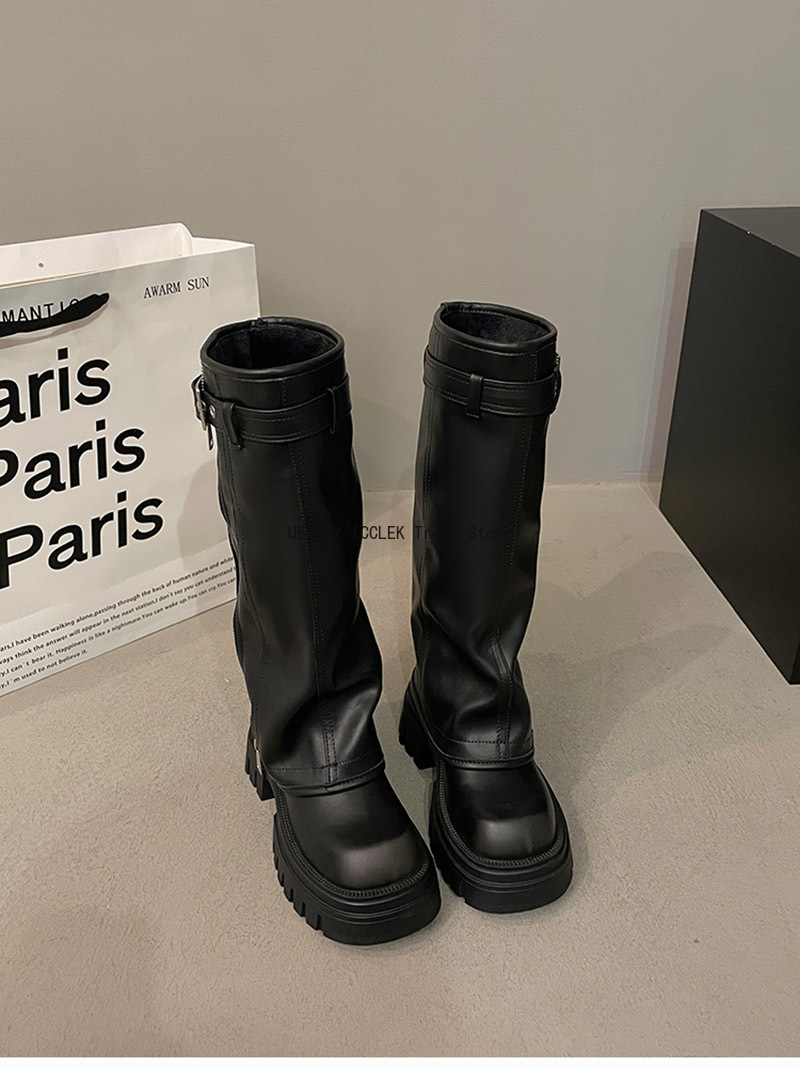 Winter Women Biker Boots Fashion Belt Buckle Ladies Elegant Platform Long Pipe Booties Casual Women’s Knee High Booties