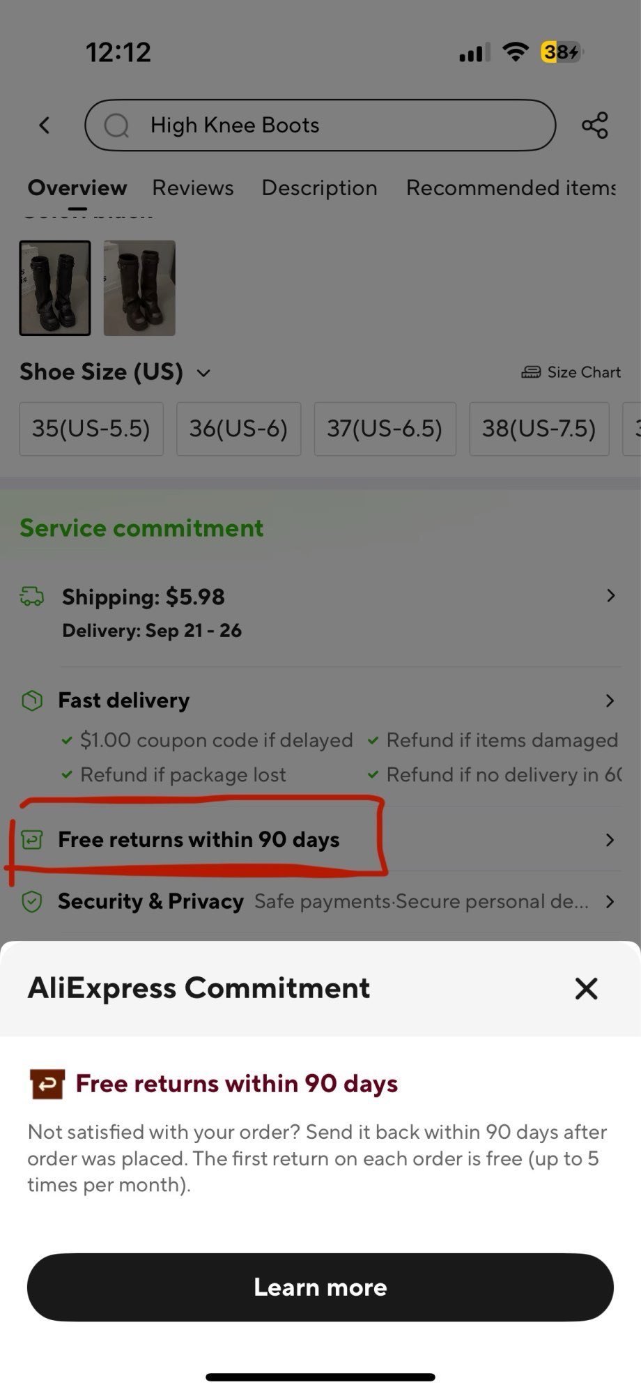 The listing promised “free returns within 90 days,” but neither the seller nor AliExpress provided a label. Instead, they told me to prepay $67 shipping for boots that cost $35 and “maybe” get refunded later. This is false advertising.