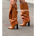 Brown Patchwork Block Heels Boots Women Chic Wide Fit Cross Belt Buckle Winter High Heel Boots Ladies Fashion Pointy Toe ShoesUSD 172.00/pair