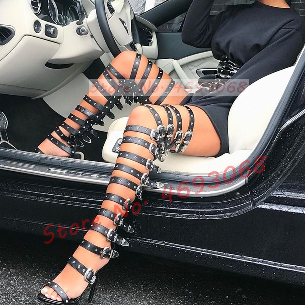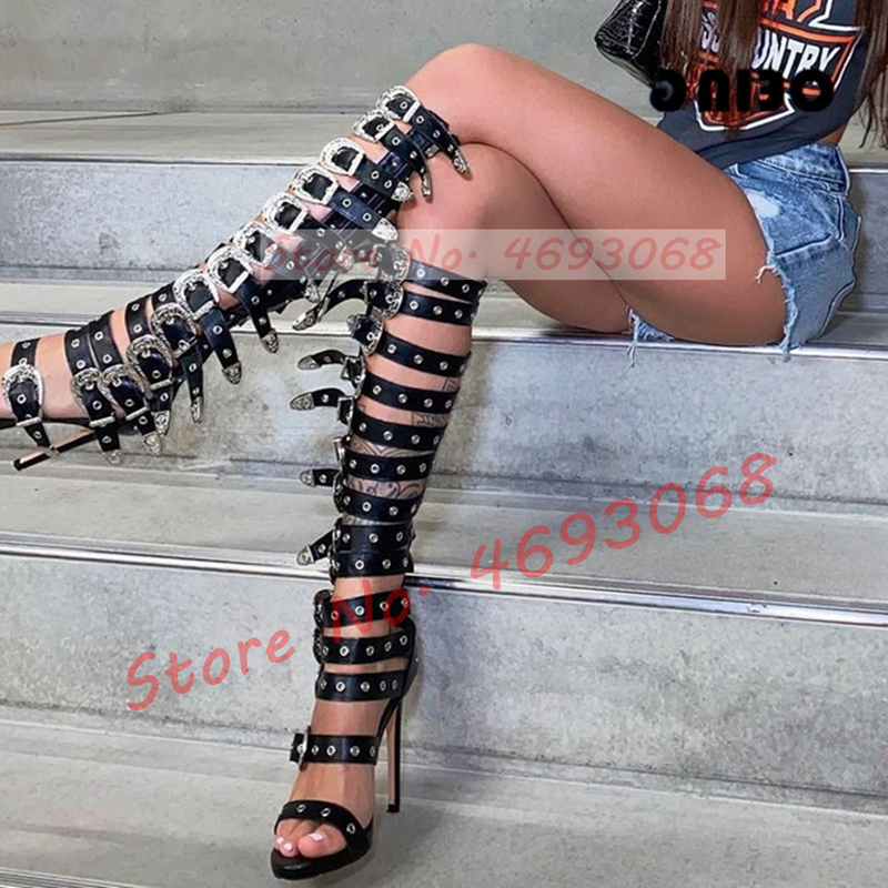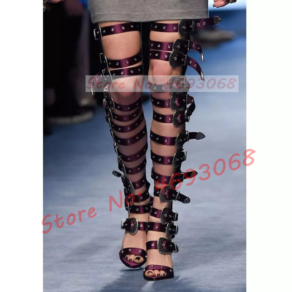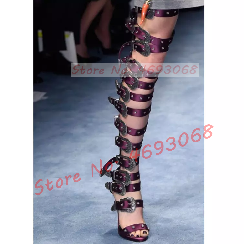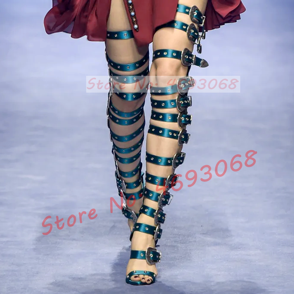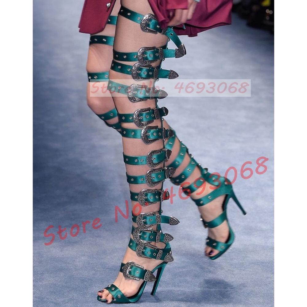 Women Buckle Strap Sandals Boots Green Thigh High Strappy Heels Metal Button Motocross Boots Hippie Boho Sexy Romans High Heels