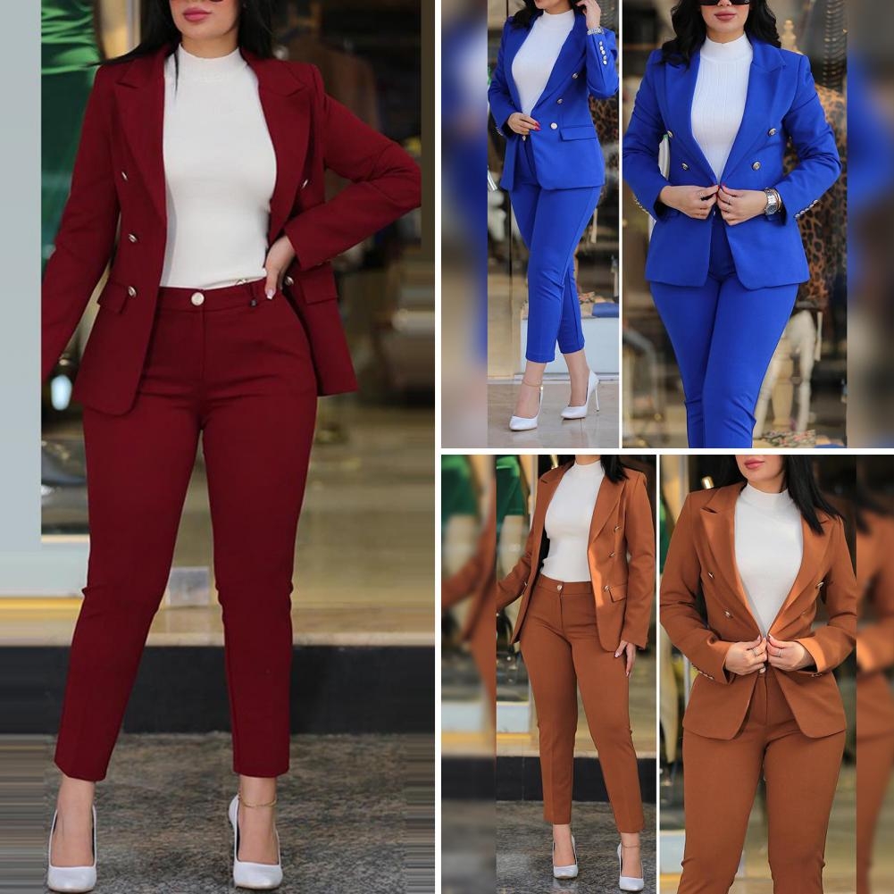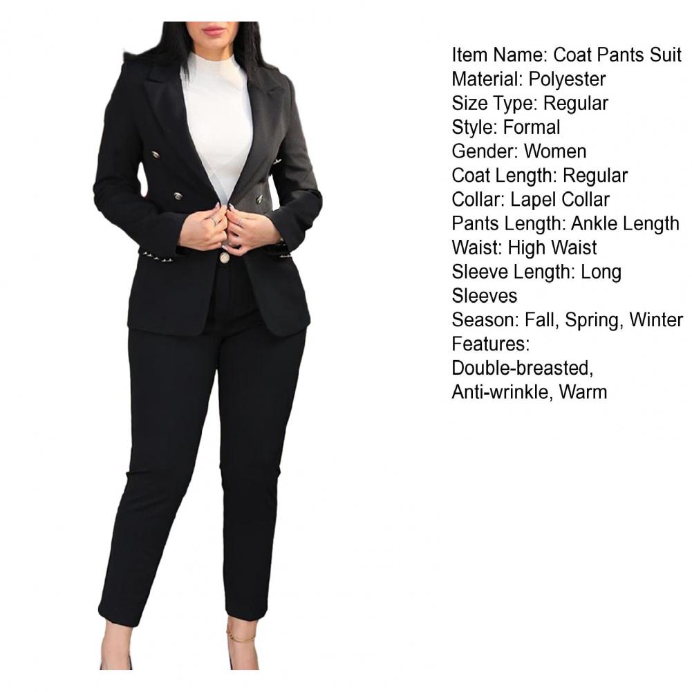 Women Commute Suit Double-breasted Women’s Coat Pants Suit with High Waist Slim Fit Pants Lapel Jacket for Formal Business