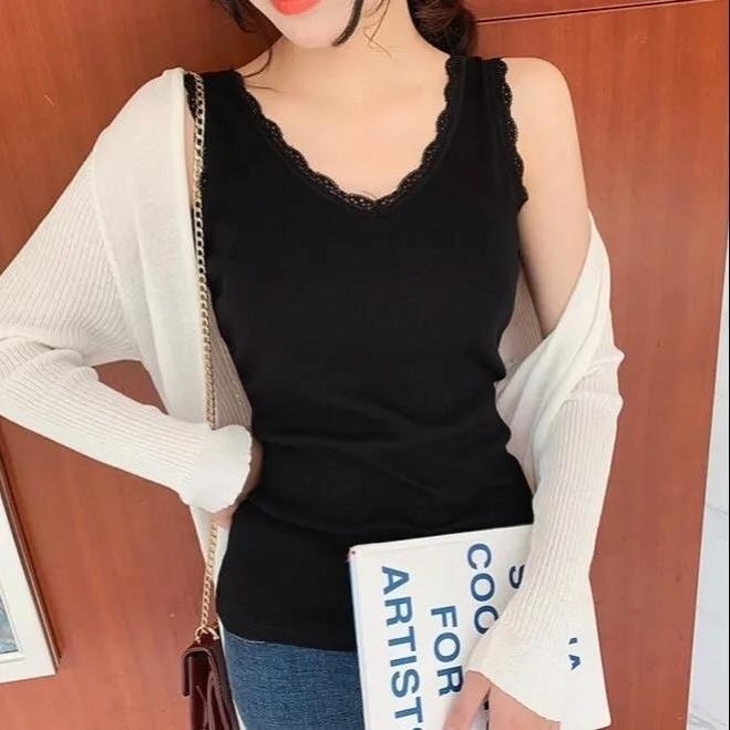 2 reviews for Women Cotton V-neck Vest With Lace Female Spring And Summer Versatile Thread Slim Fit Inside And Outside Crop Tank Top