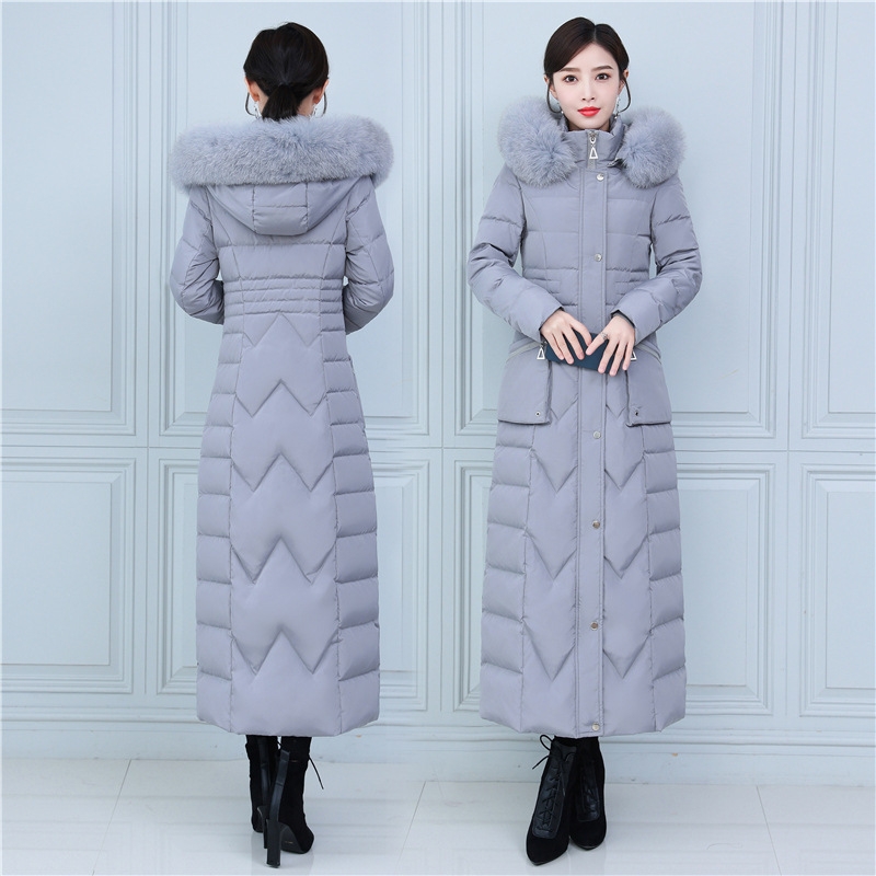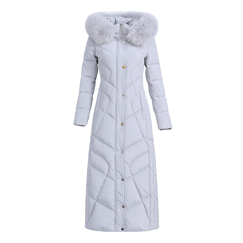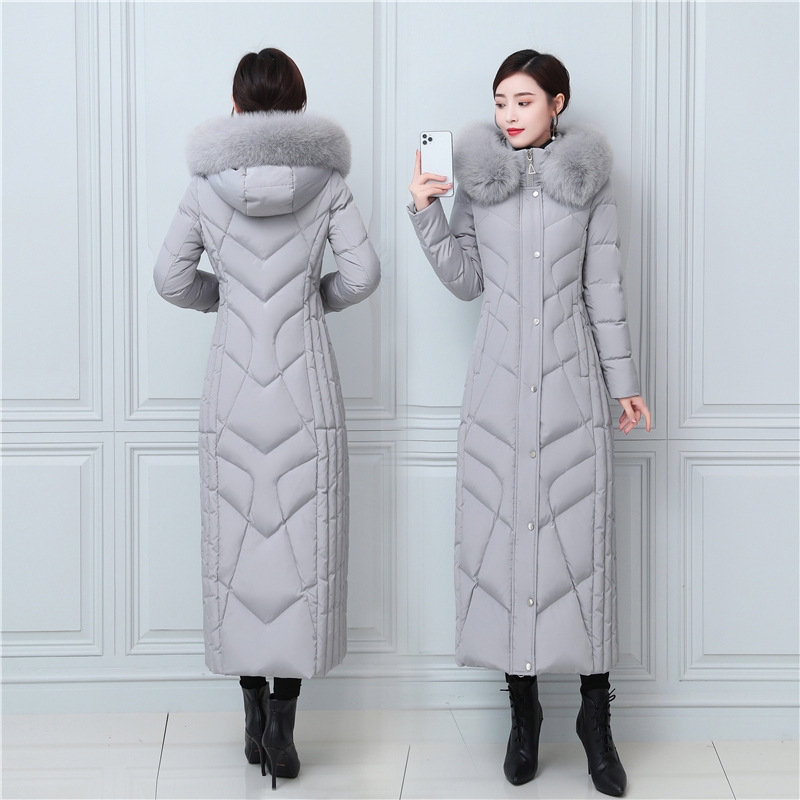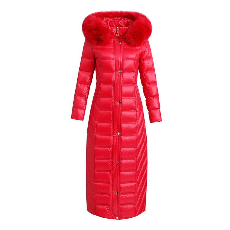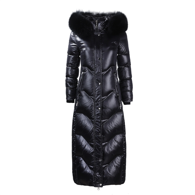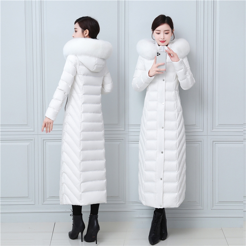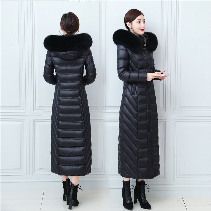 Women Down Coat Slim Fit Length 125cm Thickening Windproof Waterproof Detachable Fox Fur Collar X-Long Duck Down Jacket