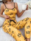 Women Fashion Pajama Print Sexy Lace Trim Faux Silk Satin Pajama Set Gown Skin Friendly Comfort Loungewear Sexy Pajamas