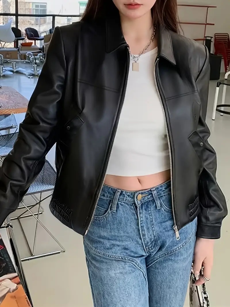 Women Fashion PU Motorcycle Jacket Zipper Pocket Leather Short Jacket