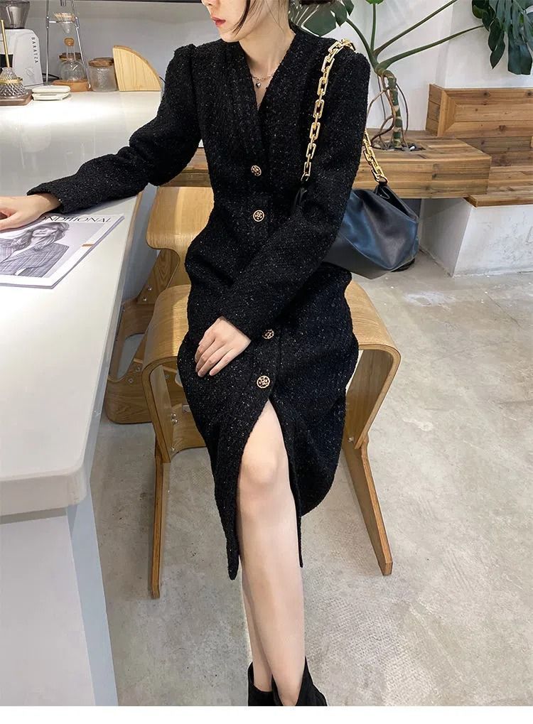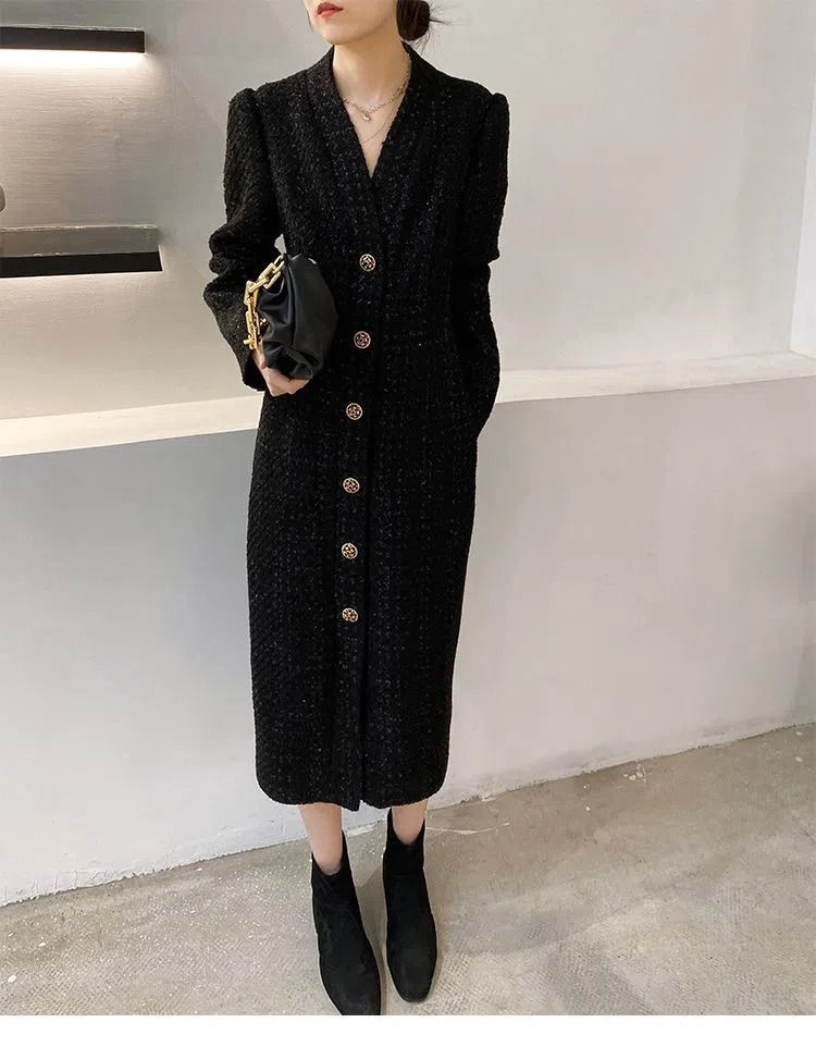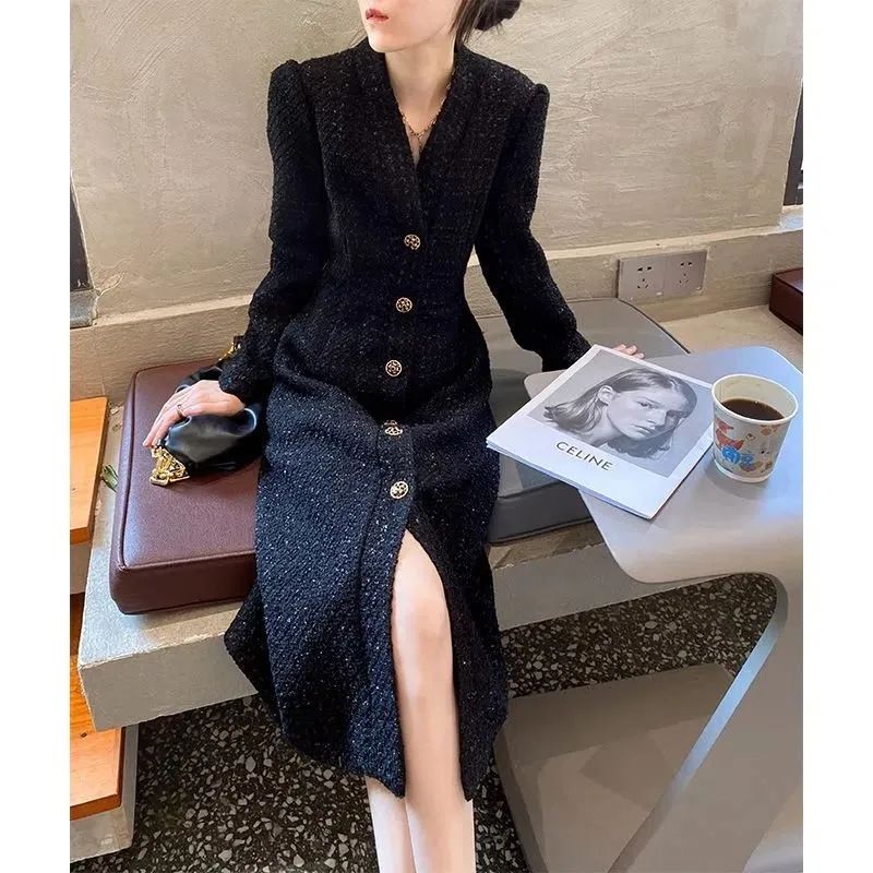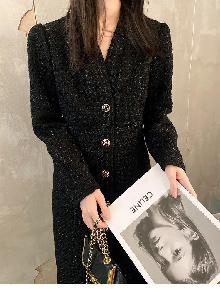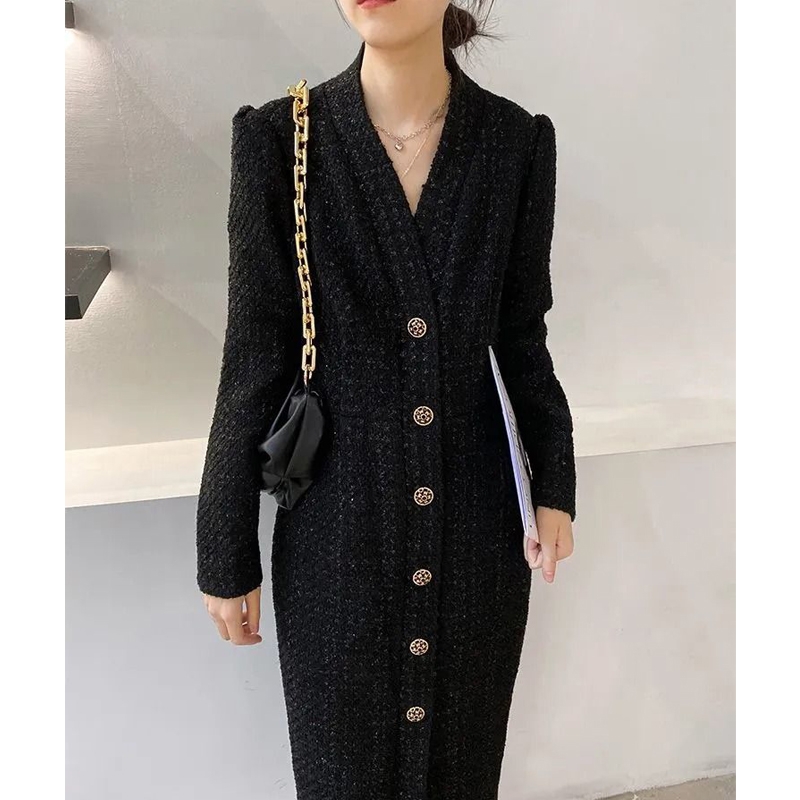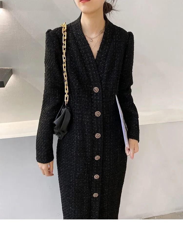 Women Hepburn Style Luxury Chic Vintage Single Breasted Woolen Dresses Office Lady Elegant V Neck Long Sleeve Slim Dress Vestido