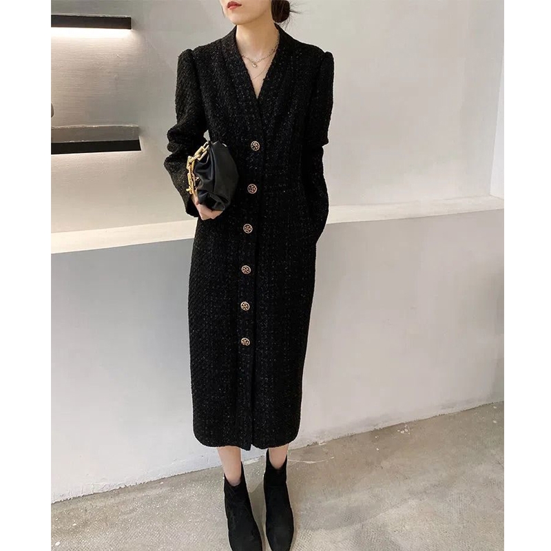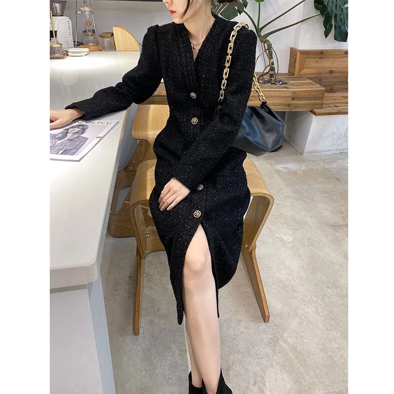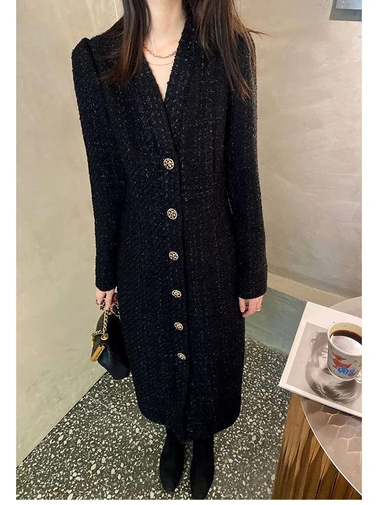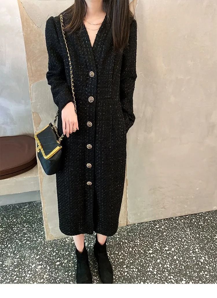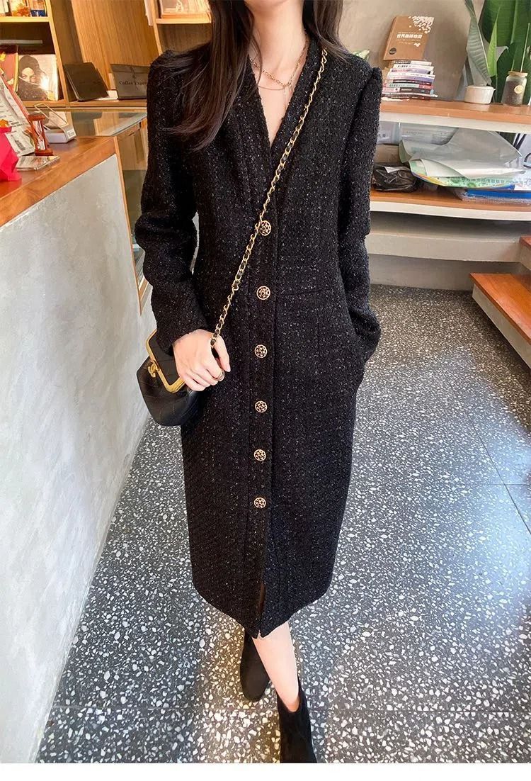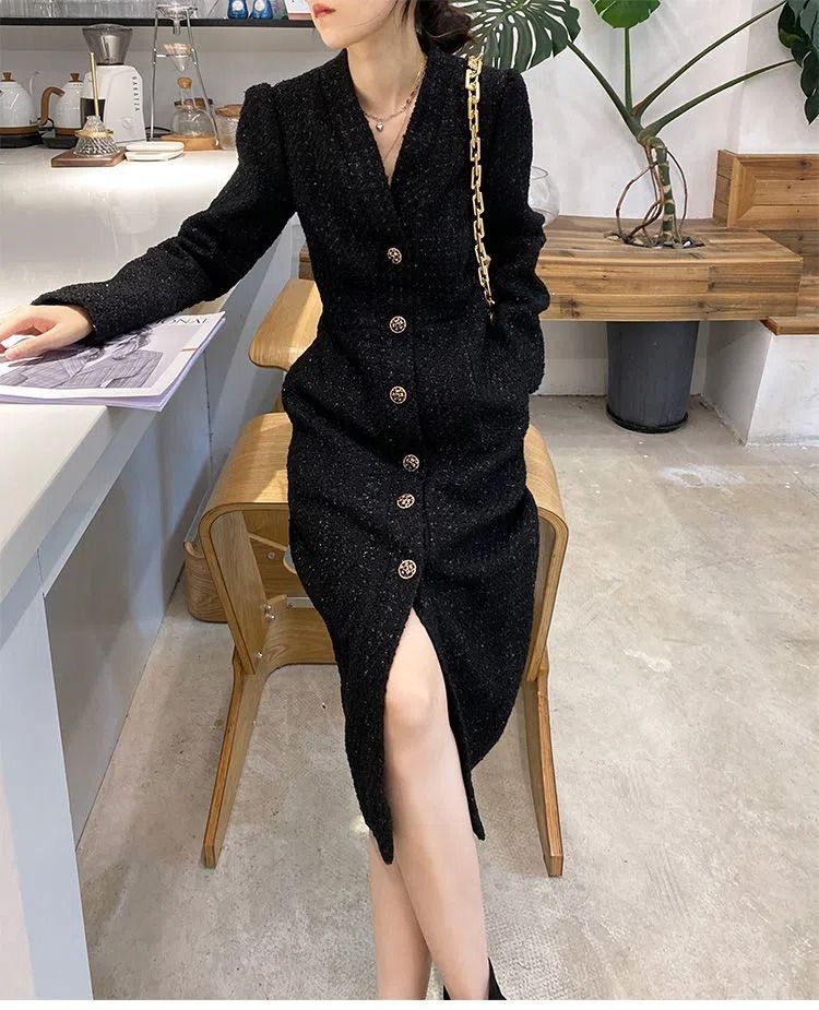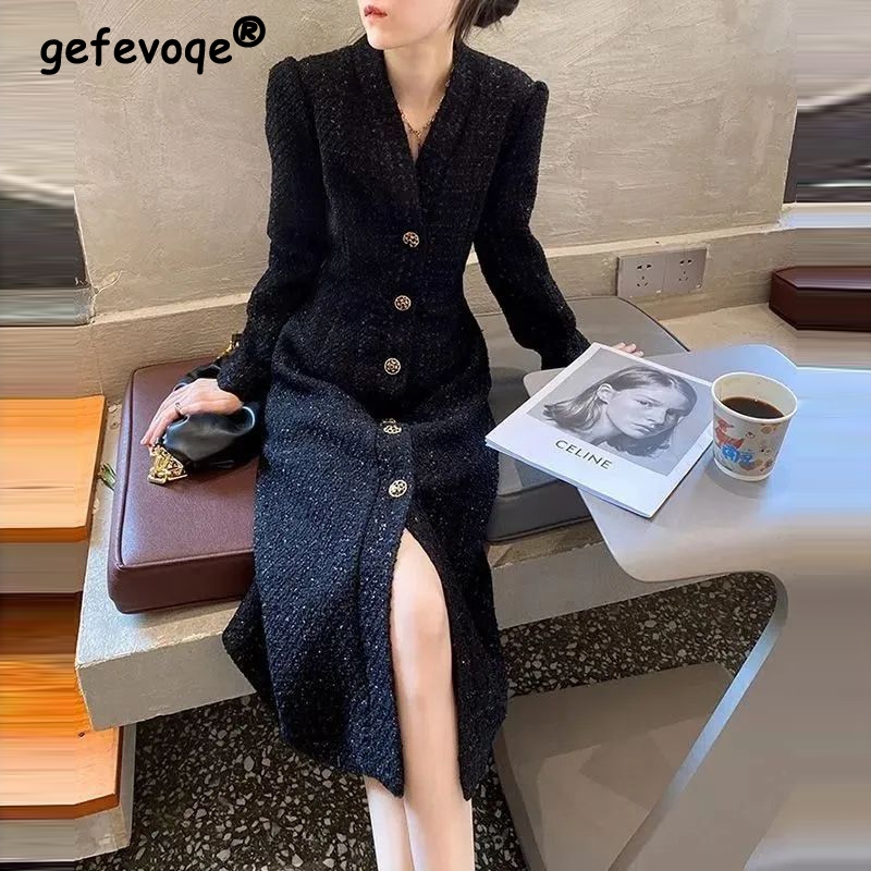 Women Hepburn Style Luxury Chic Vintage Single Breasted Woolen Dresses Office Lady Elegant V Neck Long Sleeve Slim Dress Vestido