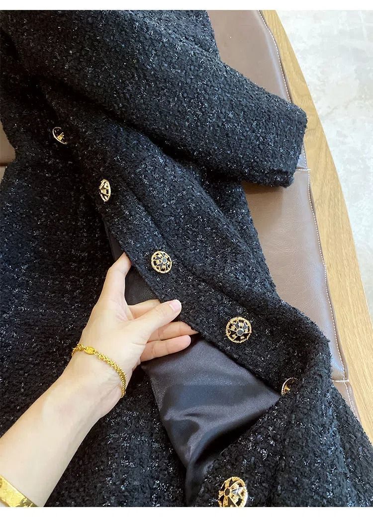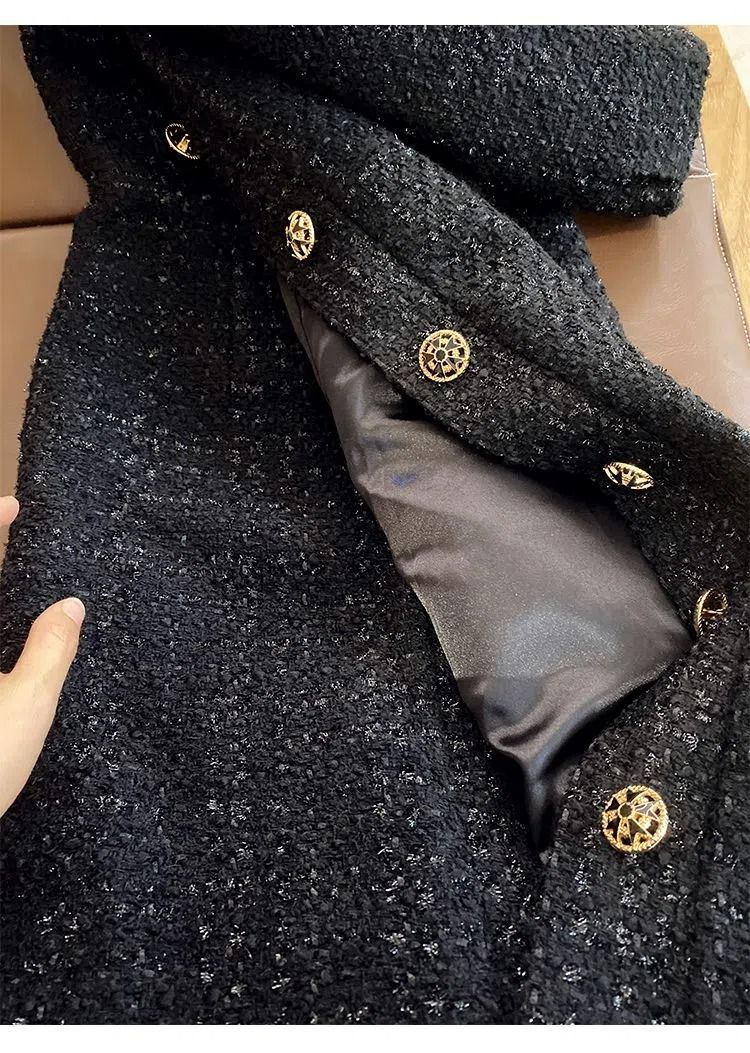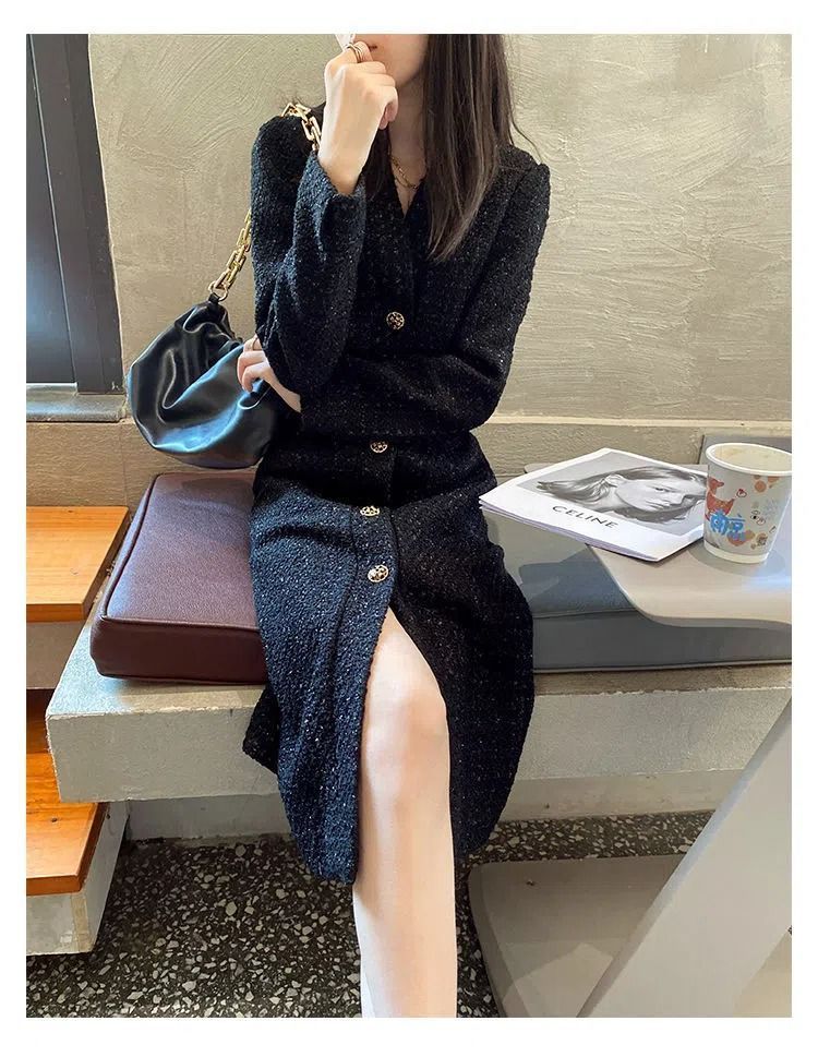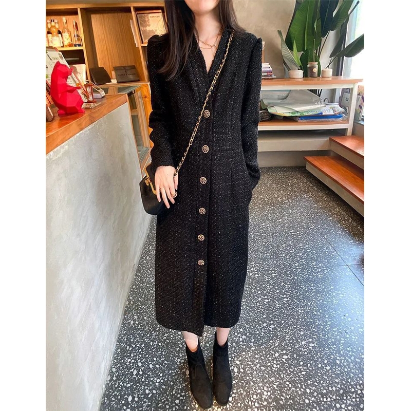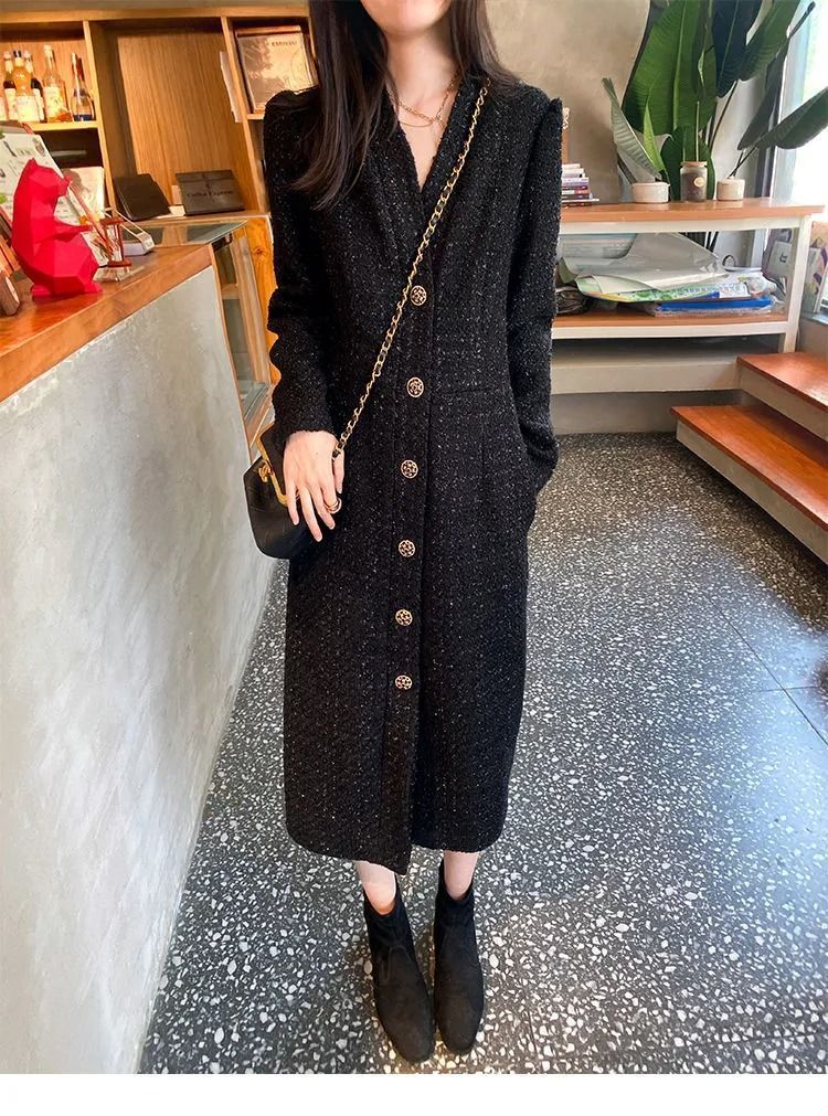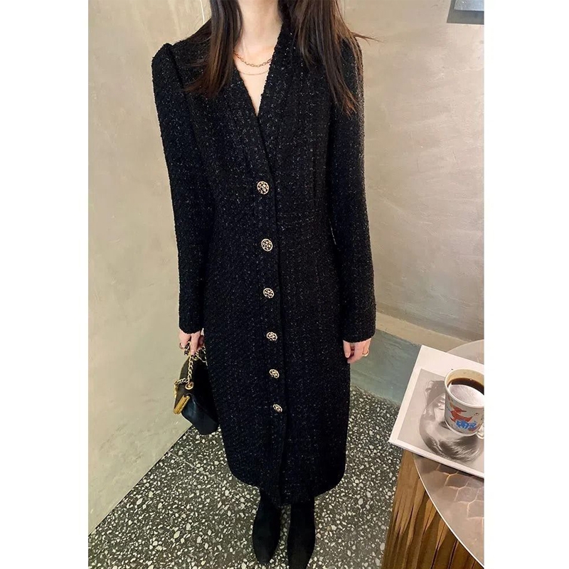 Women Hepburn Style Luxury Chic Vintage Single Breasted Woolen Dresses Office Lady Elegant V Neck Long Sleeve Slim Dress Vestido