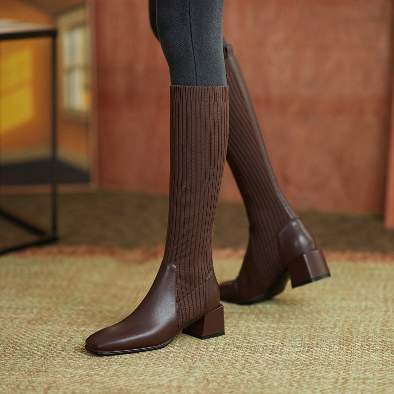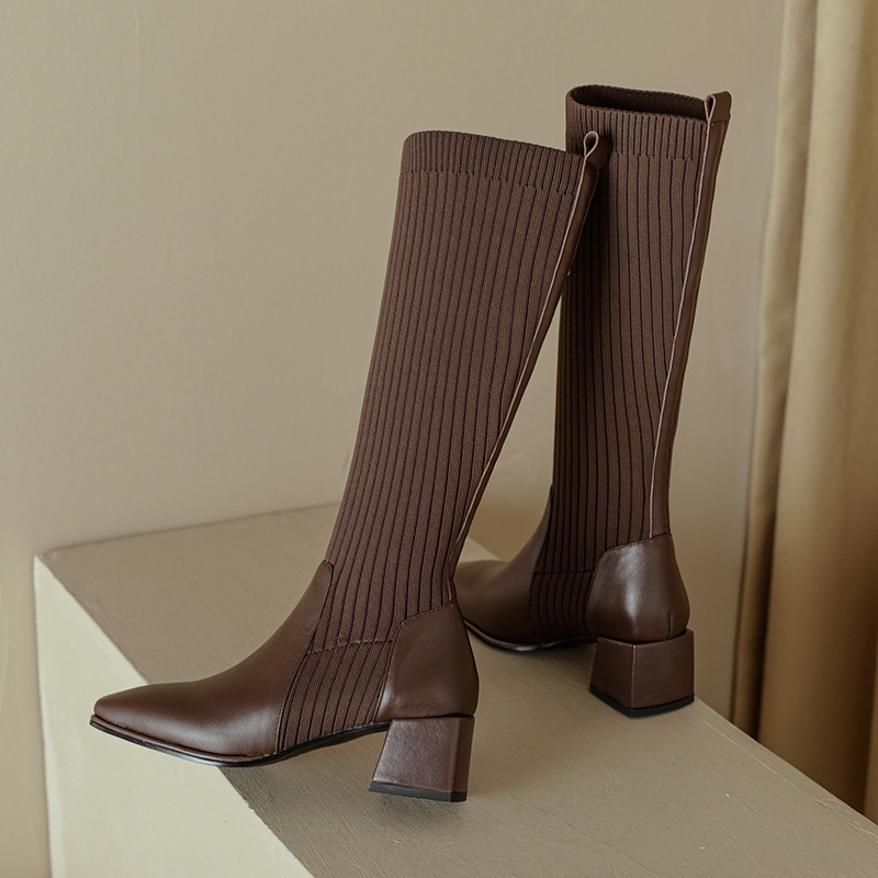 Women Knitted Long Boots Autumn Winter New Knee High Socks Shoes Woman Fashion Slip on High Heels Retro Elastic Botas Mujer