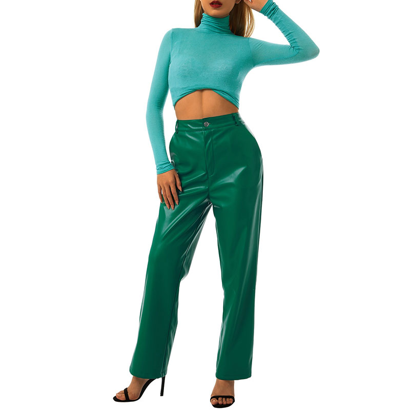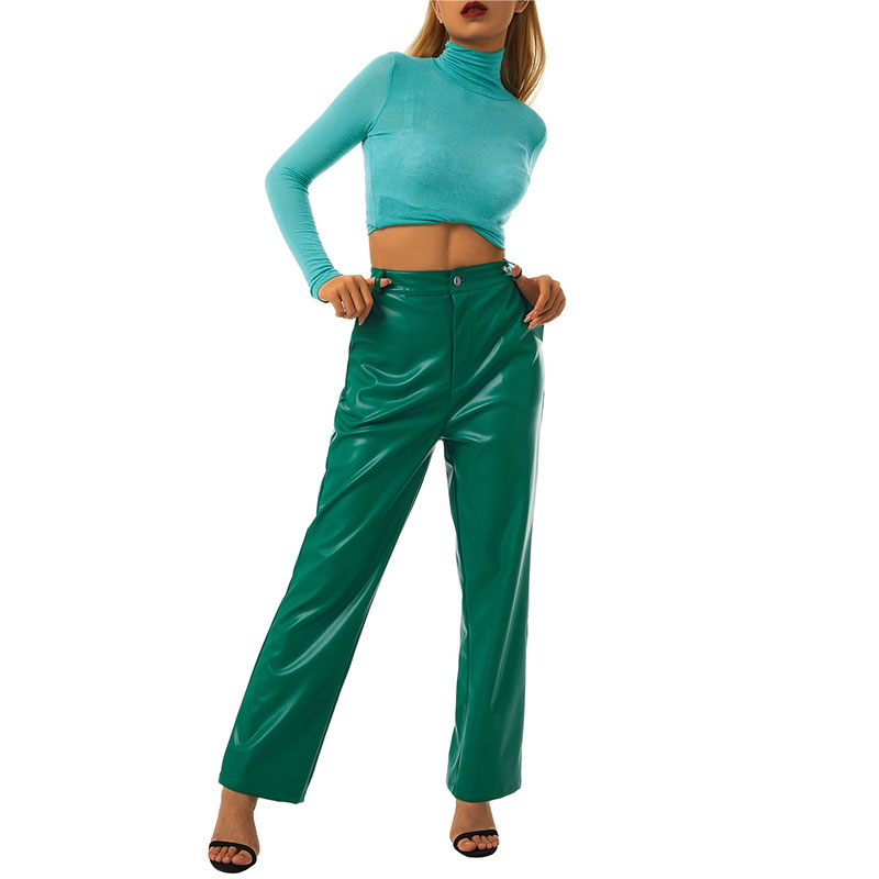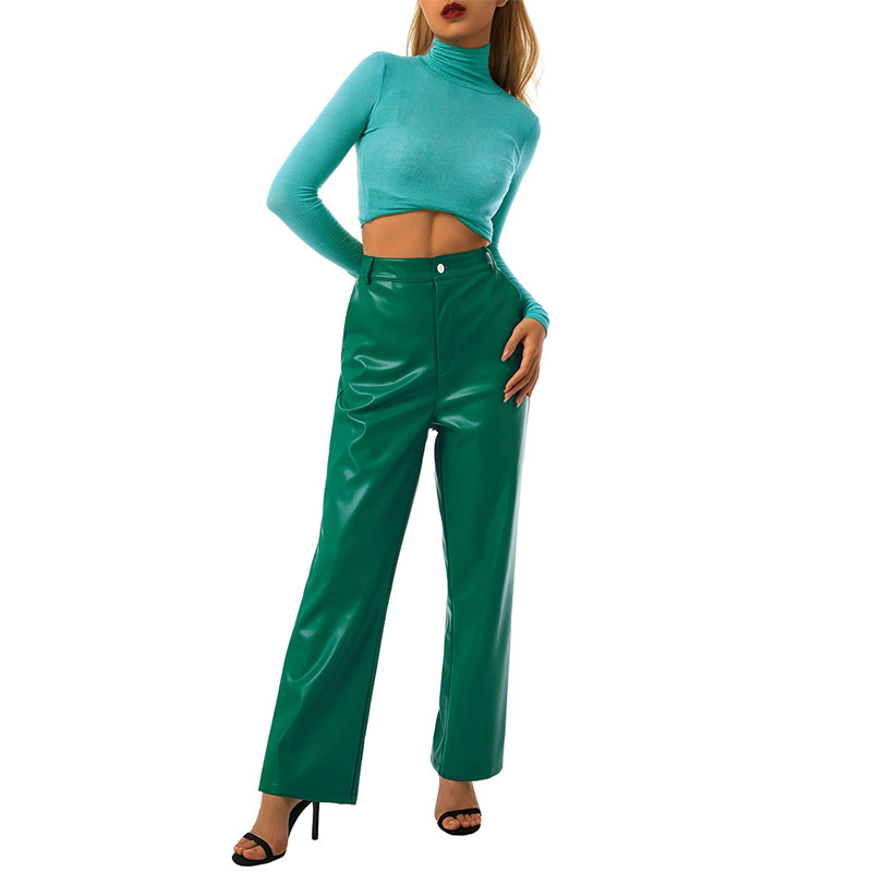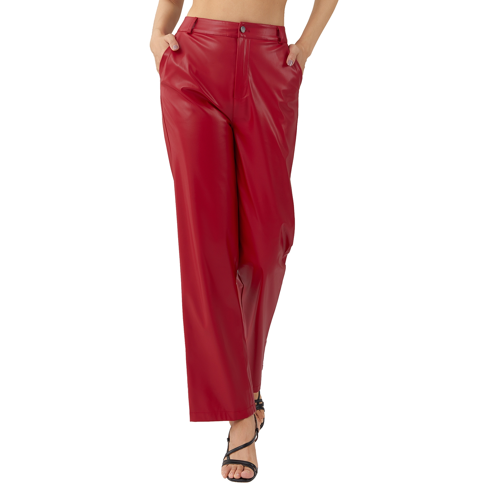 Women Loose Style PU Leather Trousers with Pockets Solid Color High Waist Straight-leg Pants Brown/ Black/Green/Red