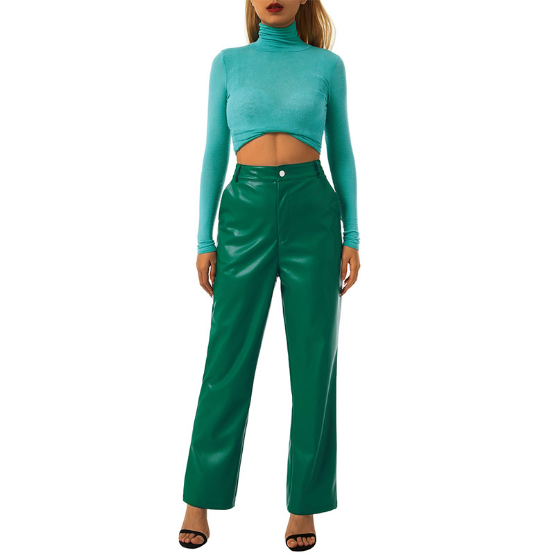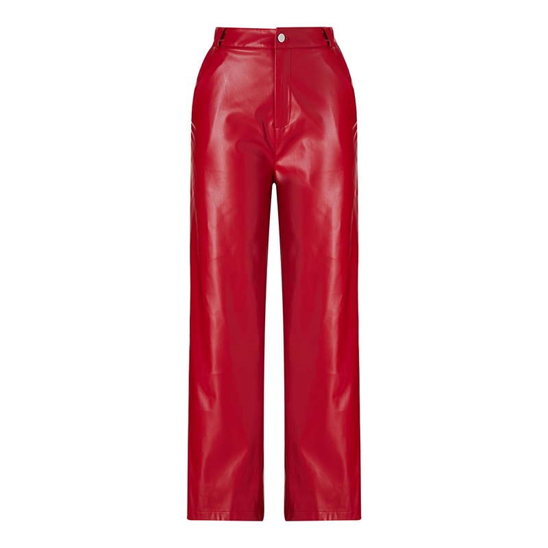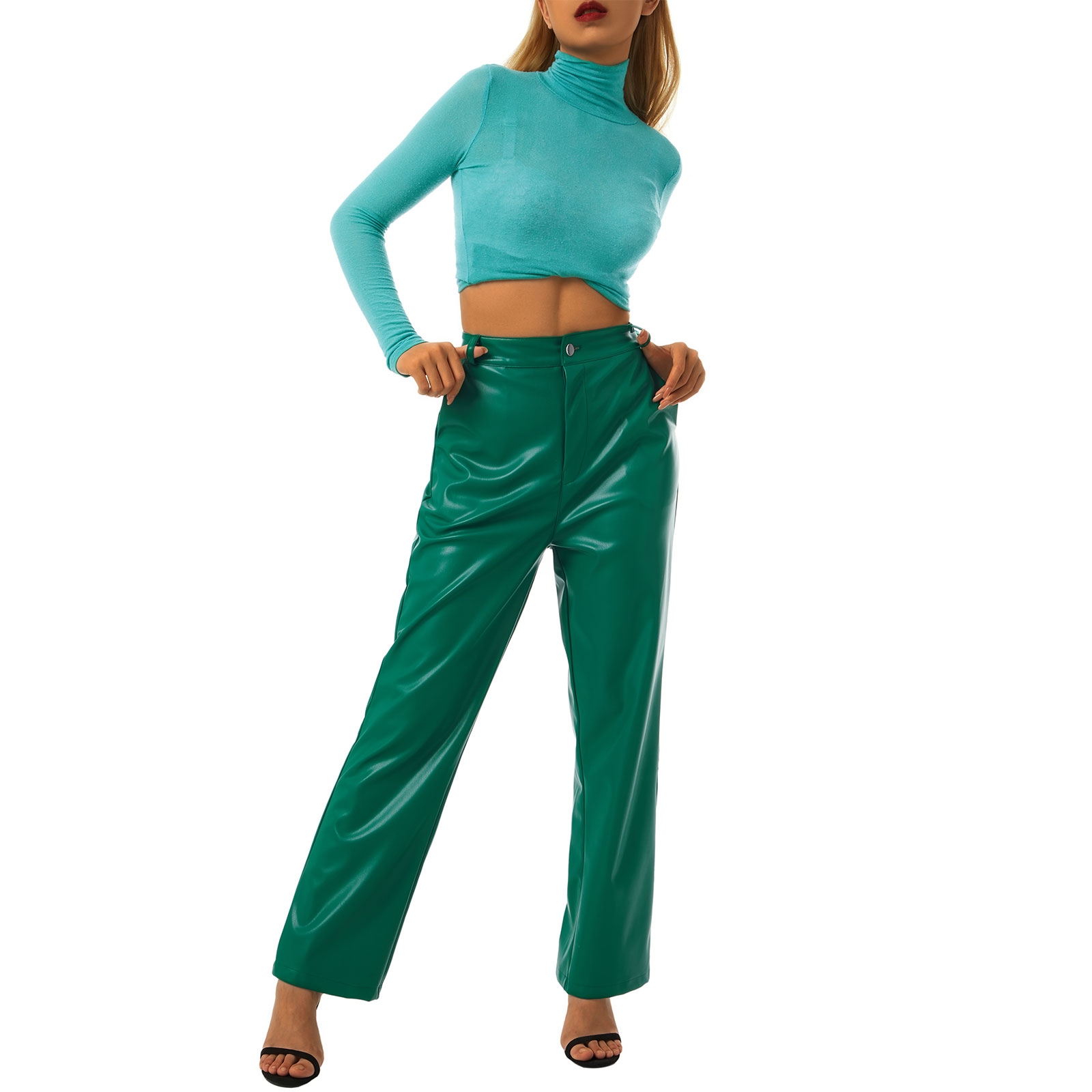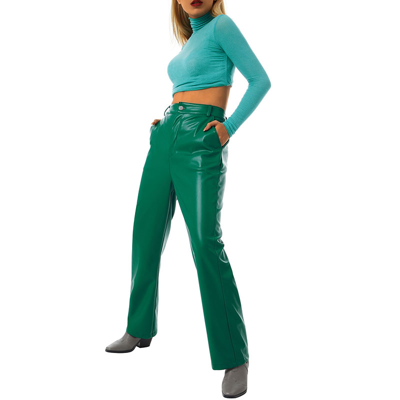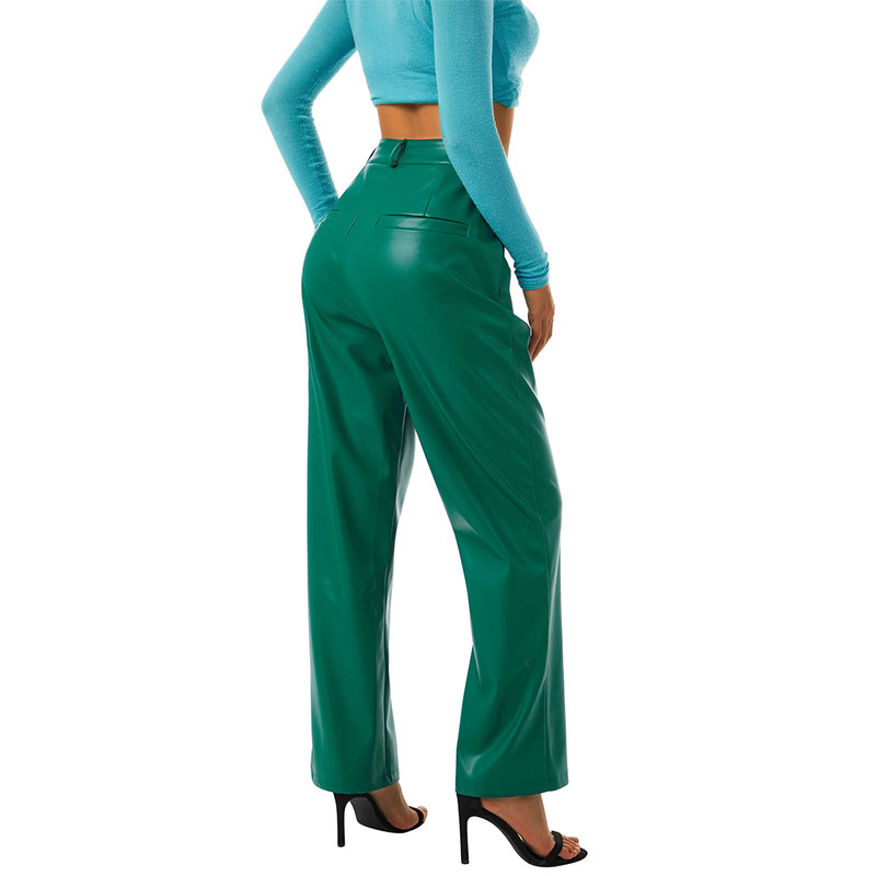 Women Loose Style PU Leather Trousers with Pockets Solid Color High Waist Straight-leg Pants Brown/ Black/Green/Red