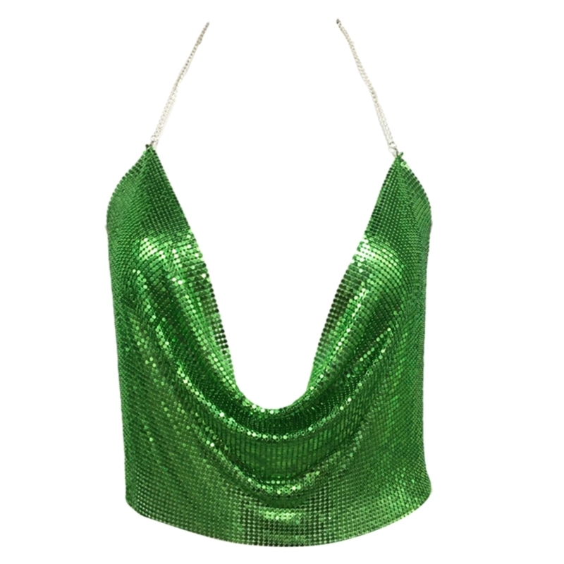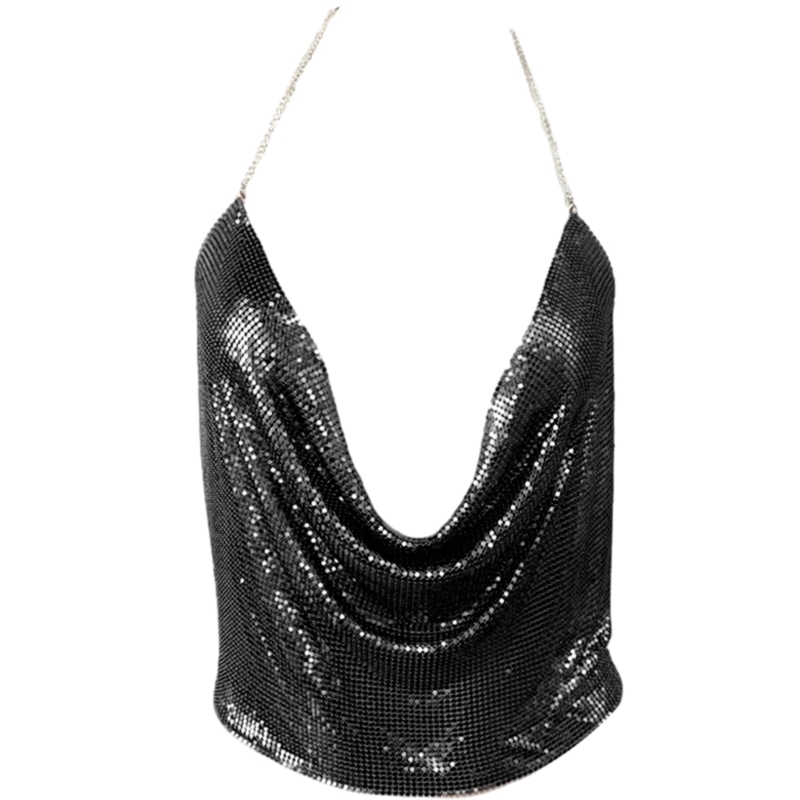 Women Sexy Glitter Sequins Crop Top Halter Cowl Deep V-Neck Backless Camisole Chain for Nightclub Party Outfit