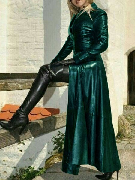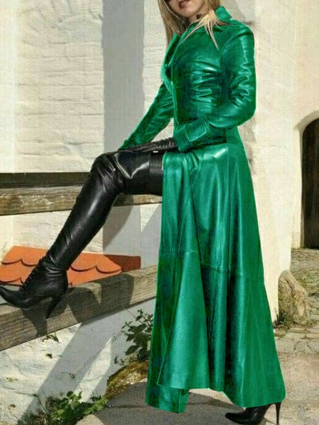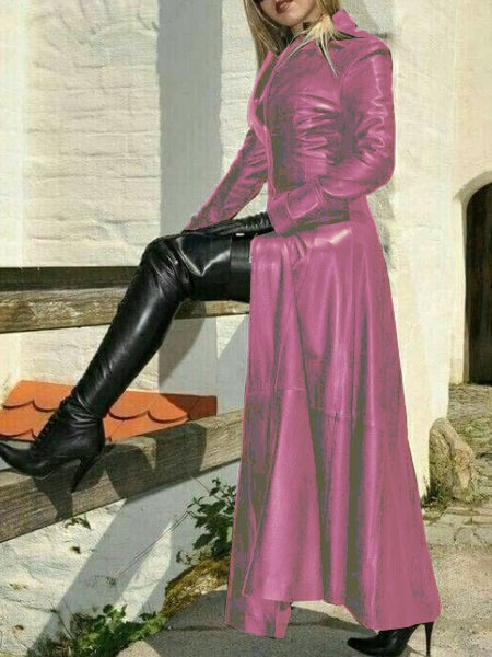 Women Vintage Faux Leather Coat Long Jacket Large Size Fake Leather Trench Coat Autumn Retro Overcoat Fashion Womens Outfit