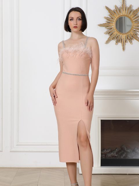 Sexy Beading Bandages Dress Women Black Feathers Elegant Clothing Celebrity Party Club Bodycon Midi Dresses