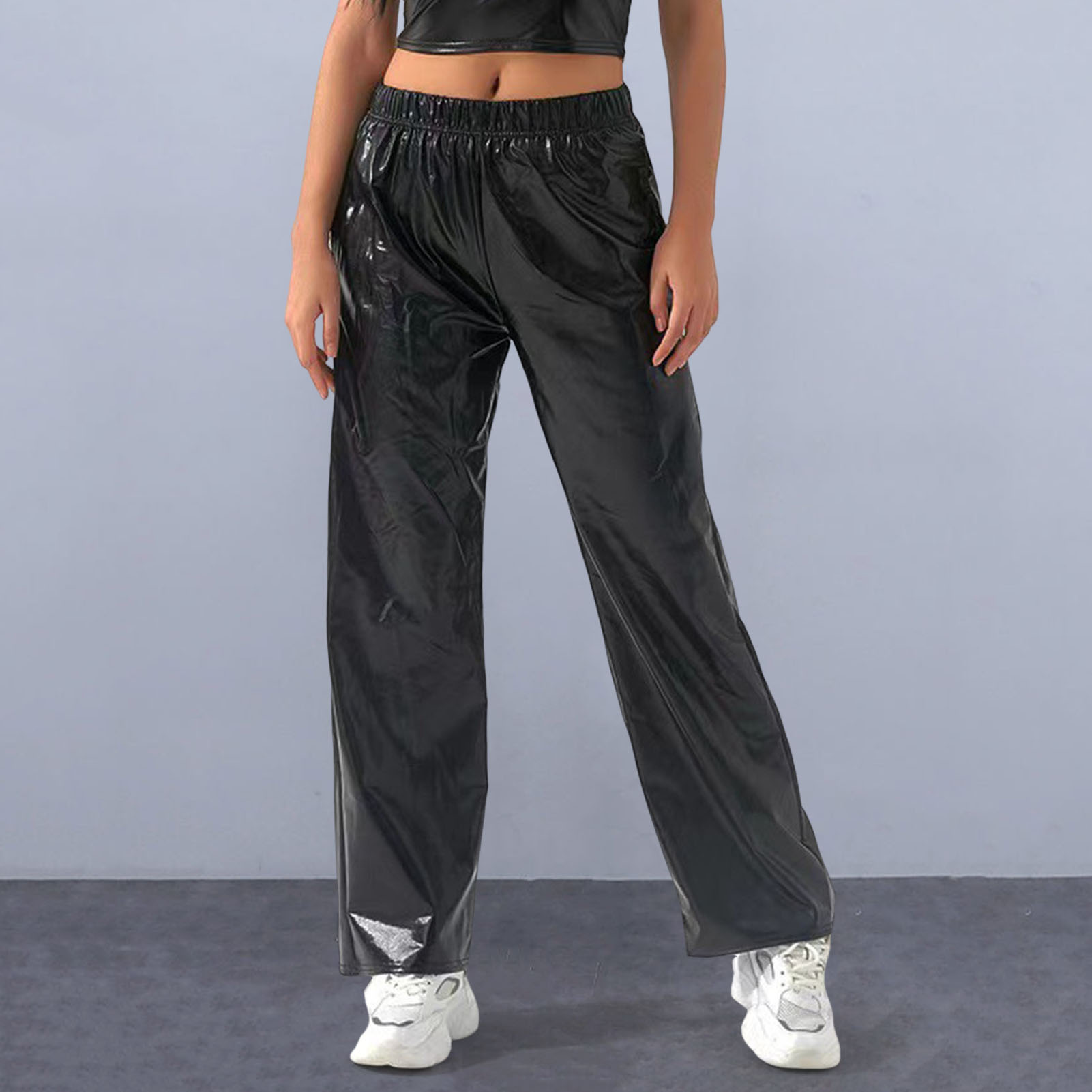 Enhance your wardrobe with these versatile unisex mid-rise pants. Crafted from faux leather fabric, these straight-cut trousers offer a reflective surface for a trendy look.