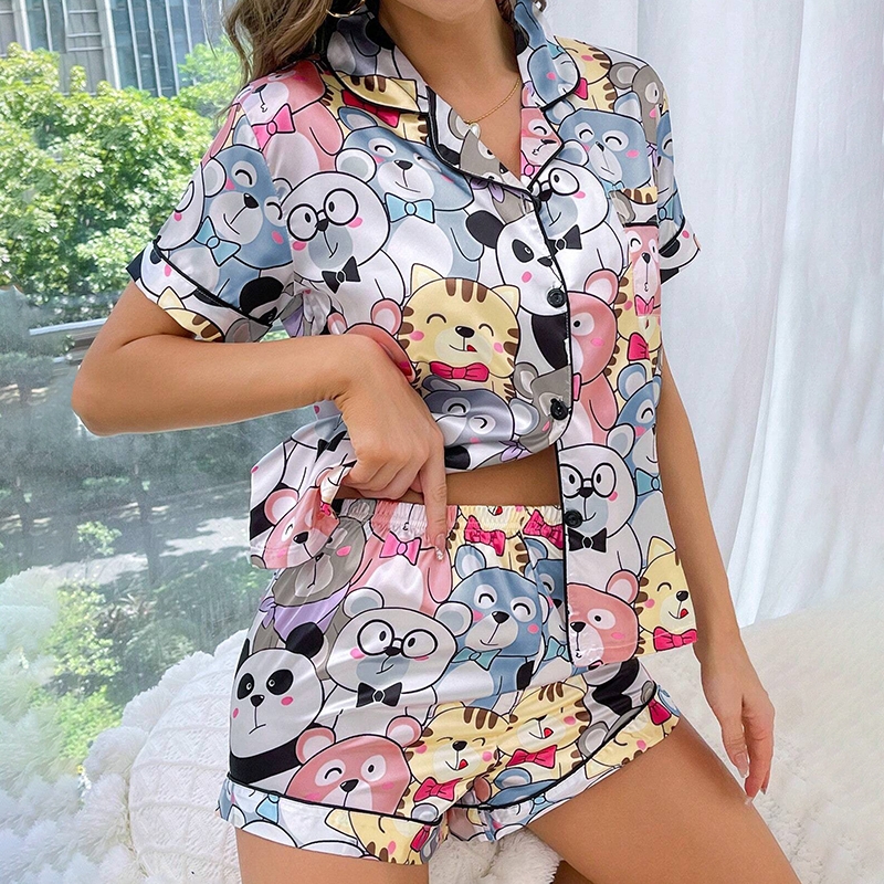 Women’s Heart-shaped Print Satin Pajama Pj Set Soft & Comfortable Short Sleeve Buttons Lapel Tops & Shorts Sleepwear Loungewear