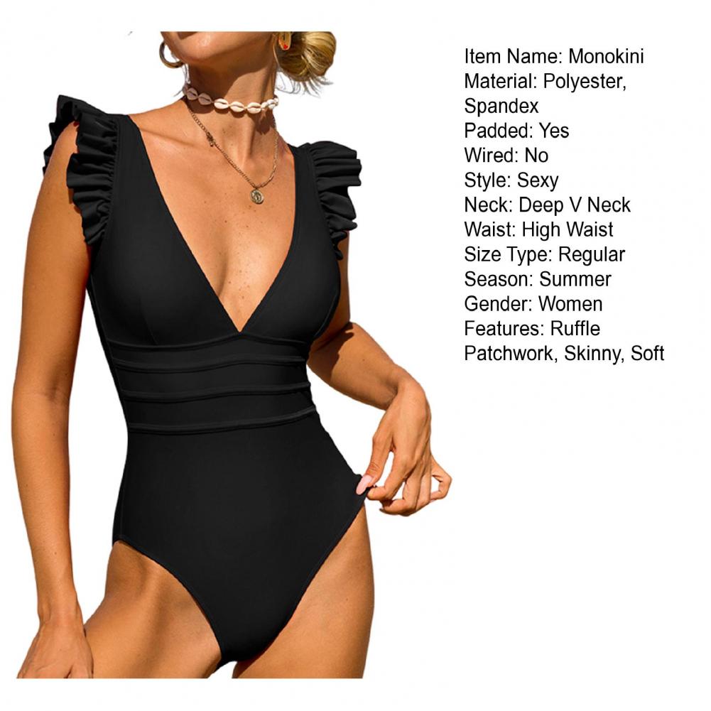 Women One-piece Monokini Ruffle Edge Deep V Neck Skinny Sleeveless Solid Color Elastic Soft Quick Dry Tight Waist Detachable Pads Wireless Surfing Wading Sports Swimsuit