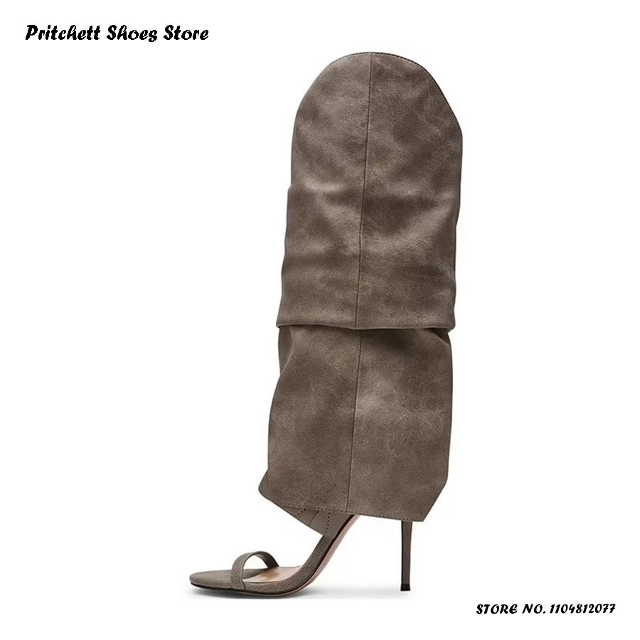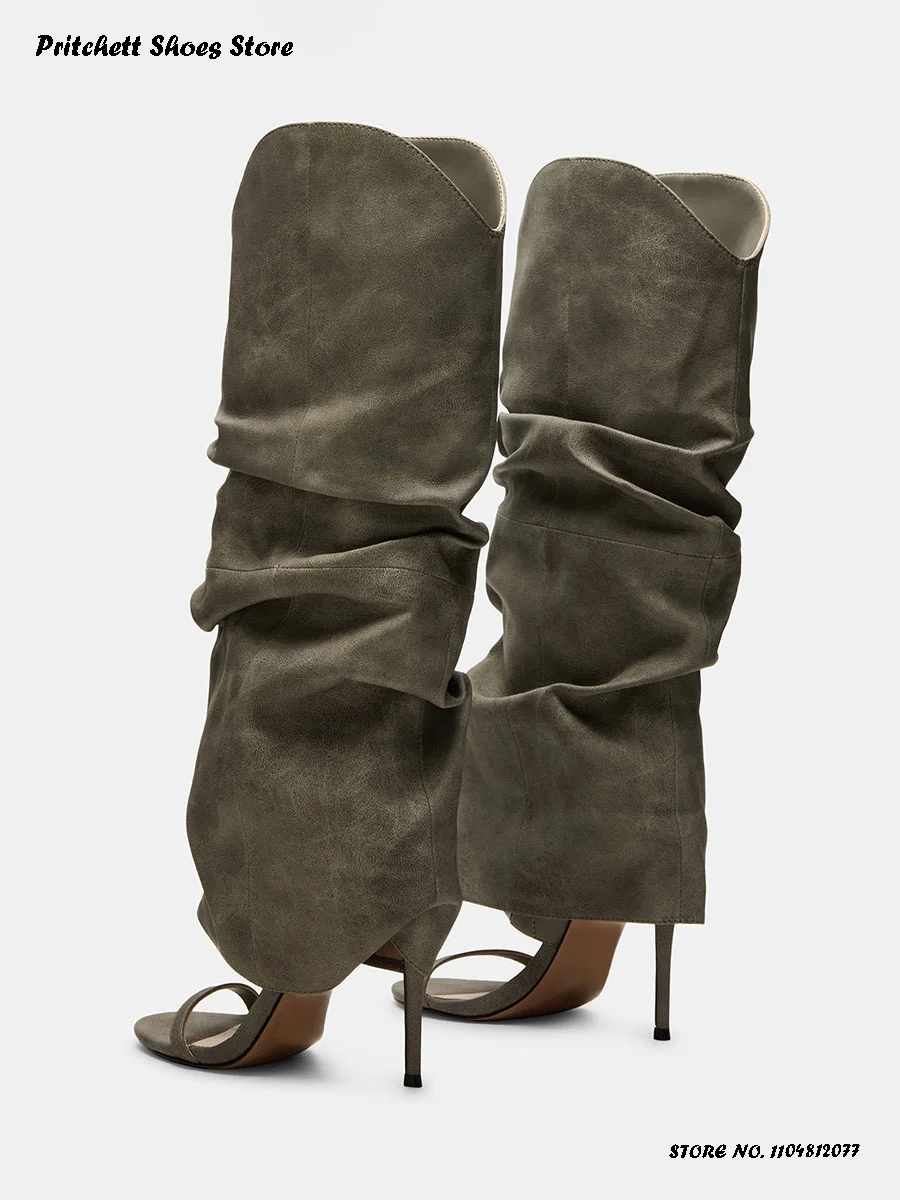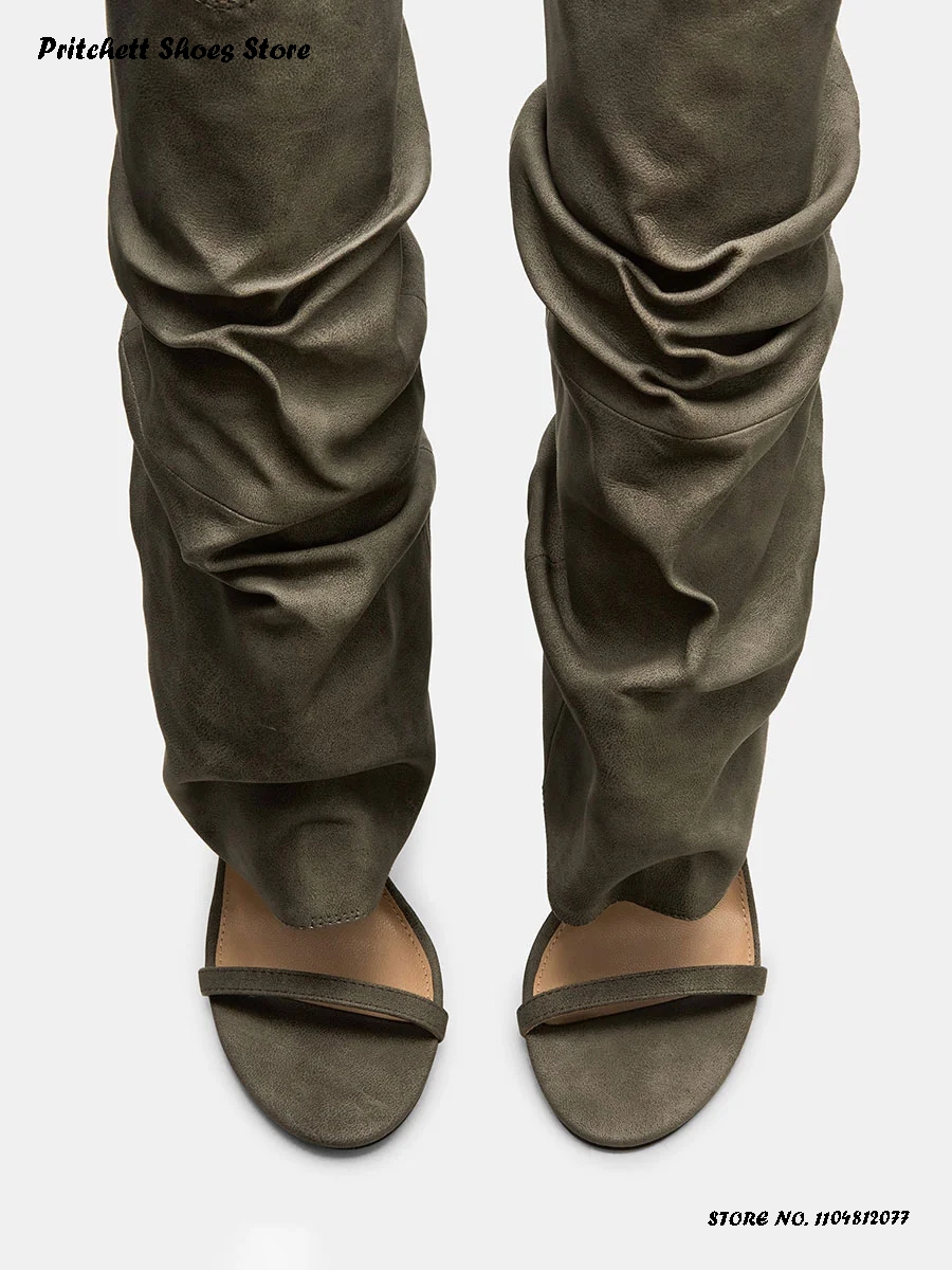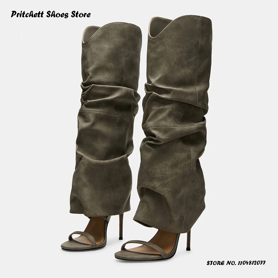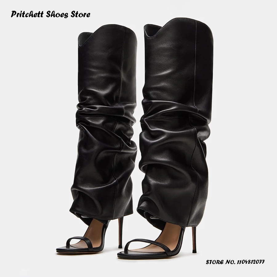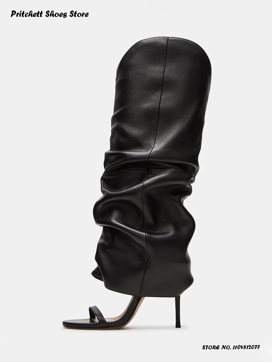 Women’s Pleated Summer Knee-high Boots Elegant Round Open Toe Stiletto Fashion Boots Street Style Party Dress Solid Modern Boots