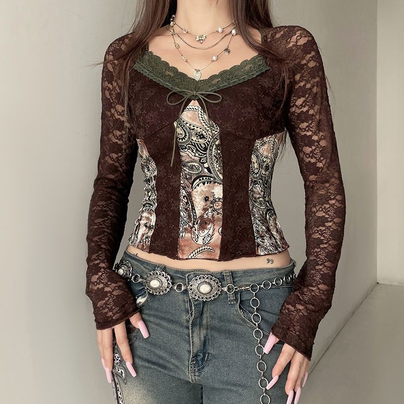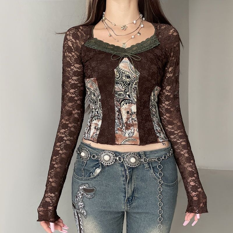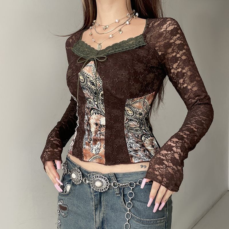 Women’s Retro Contrasting Printed Lace Patchwork T-shirt Female Long Sleeved Square Neck Slim Sexy Tops