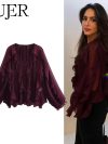 Elegant Chic Women Tops Western Patchwork Turndown Collar Slim Waist Shirt Patchwork Fringed Flare Sleeve Design Vintage Blouse
