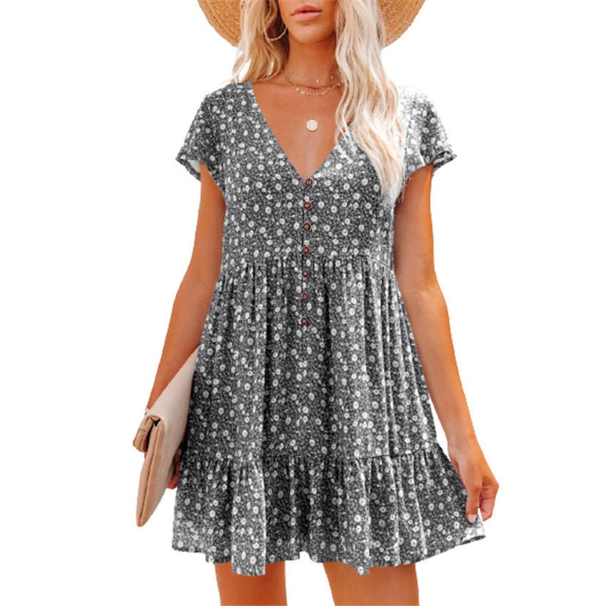 Women’s Summer Sun Dresses Floral Full Print Button Up Dress Women Beach Dress V-neck Casual Loose Dress Women’s Summer Clothing