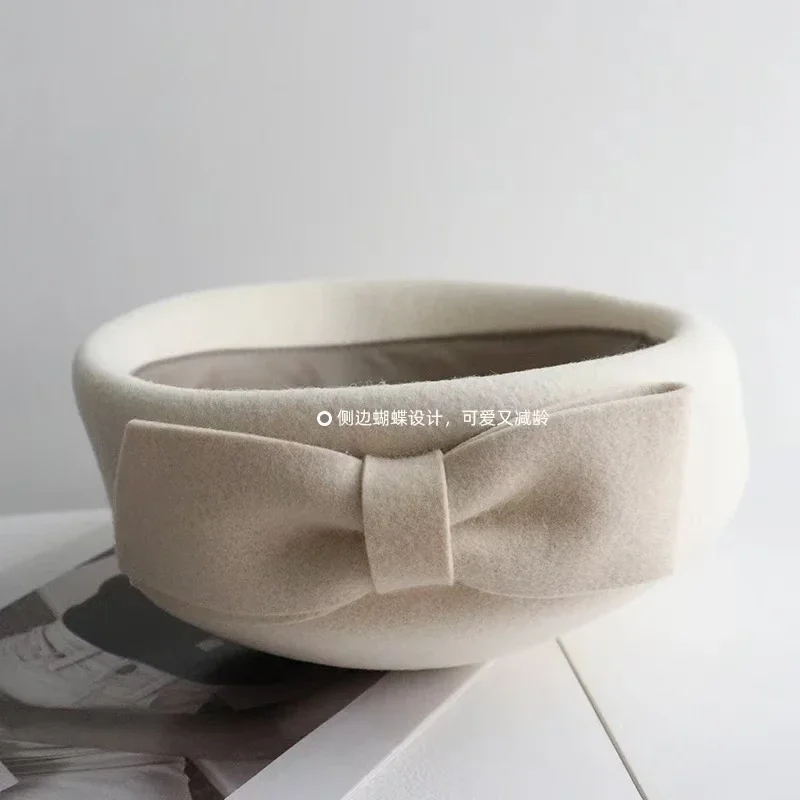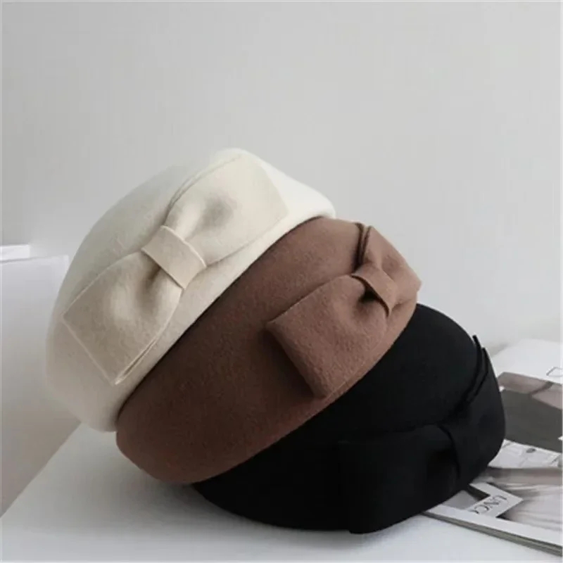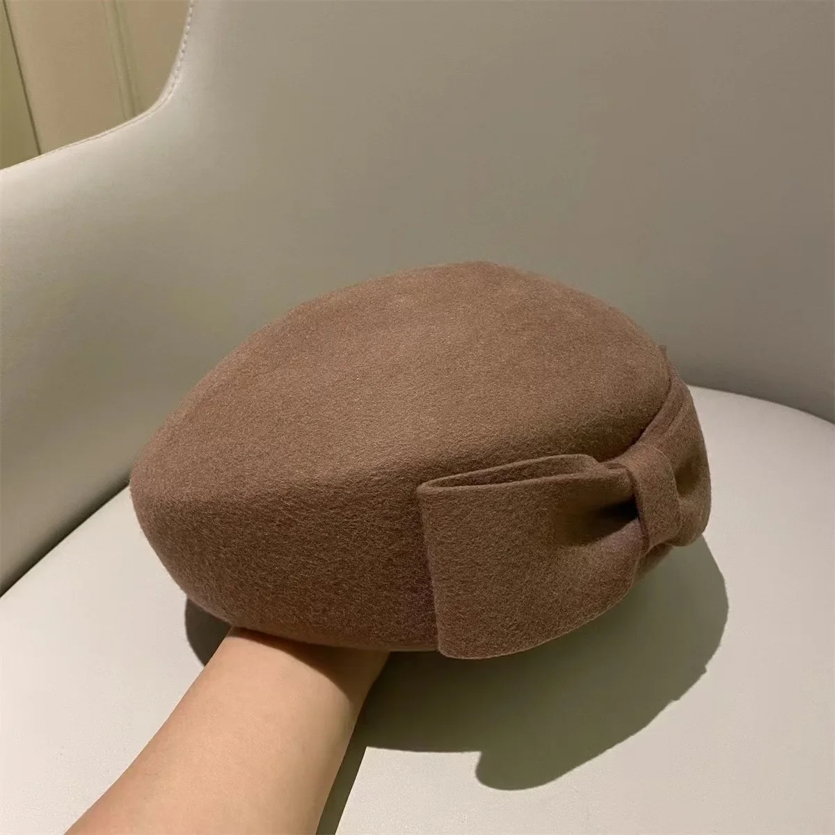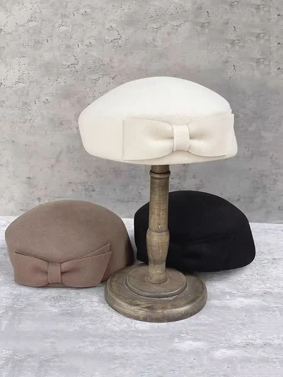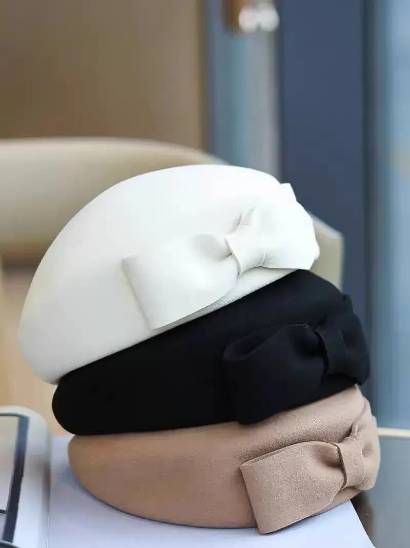 Women’s Wool Beret Hat with Bow | Winter Fascinator for Weddings & Church