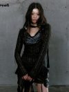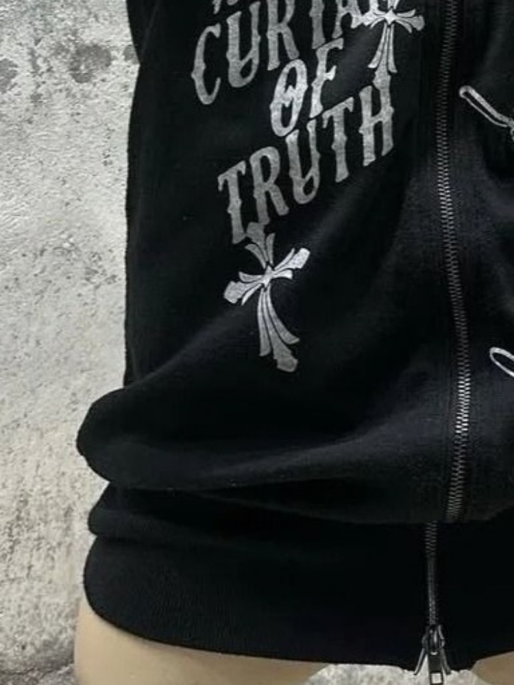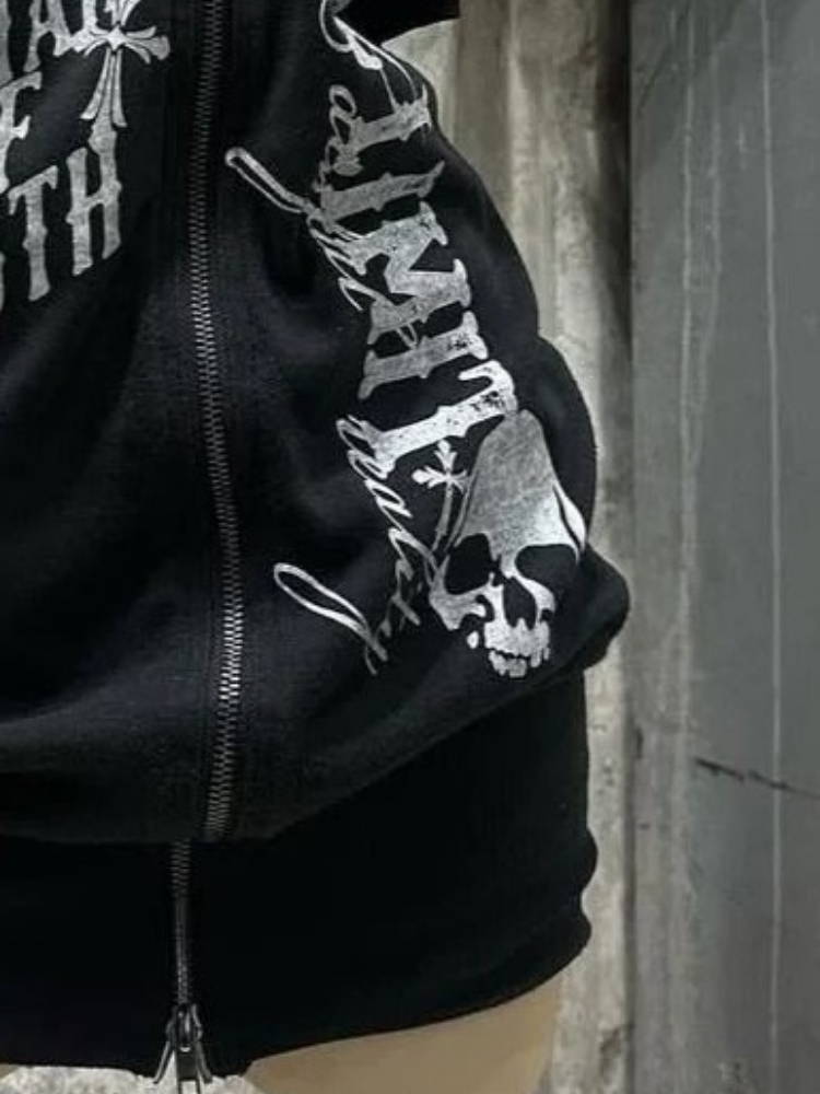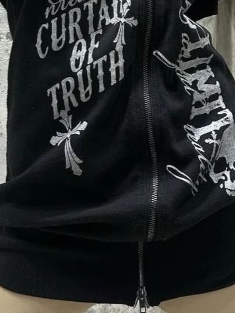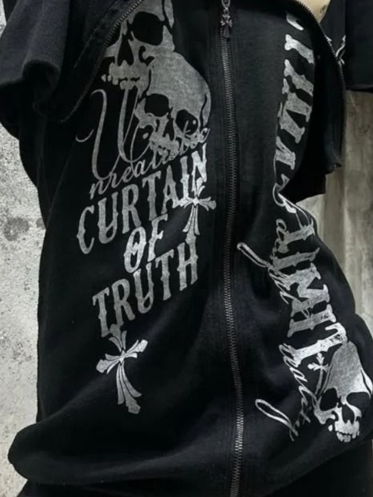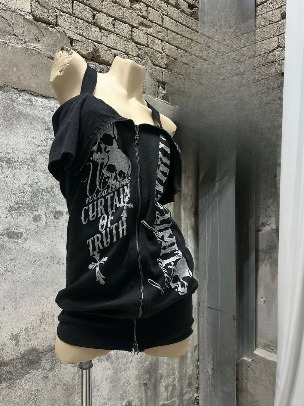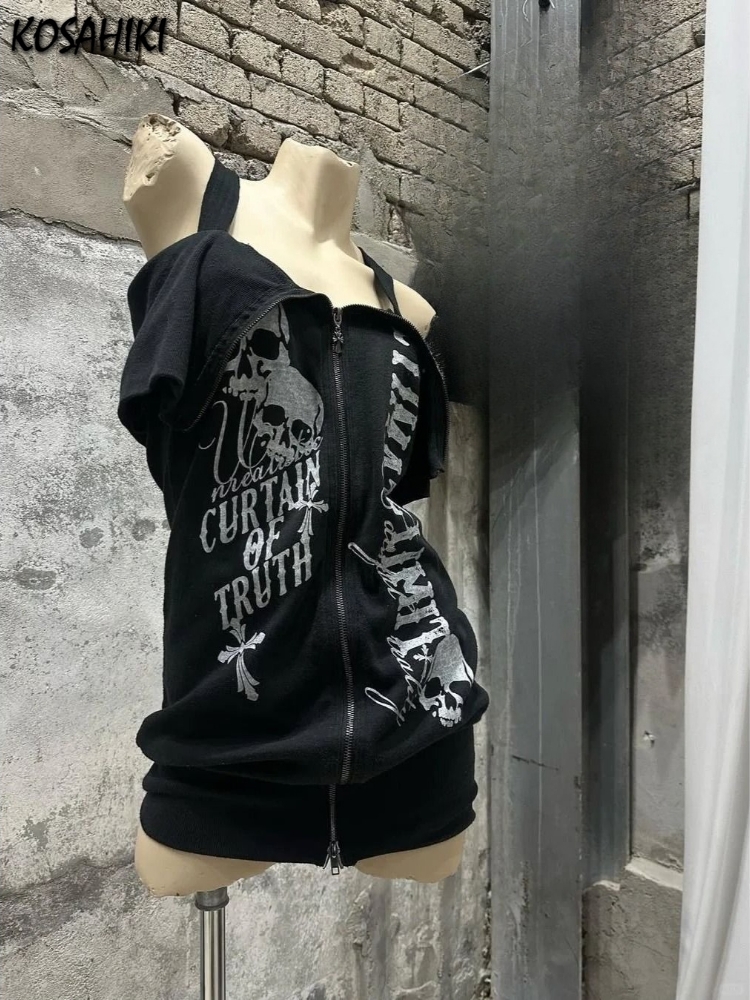 Y2k Aesthetic Skull Letter Printing Vintage Tops 2025 Streetwear Slash Neck Tshirts Women Grunge Dual Zippers Harajuku Tees